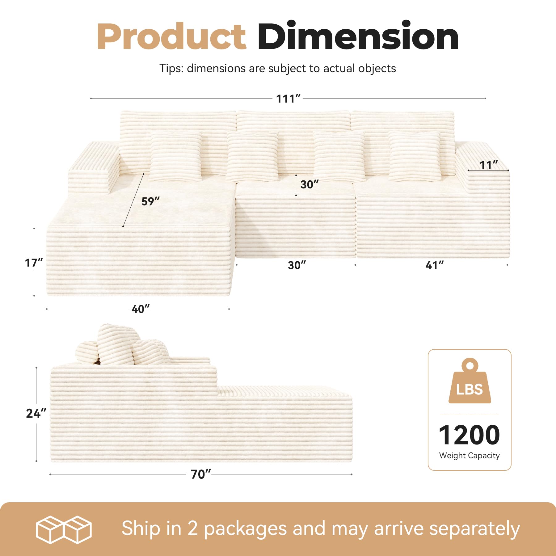 111‘’ Modular Sectional Cloud Couches with L Shaped Chaise, Upholstered Deep Seat Boneless Sofa for Living Room, Bedroom, No Assembly Required-Beige