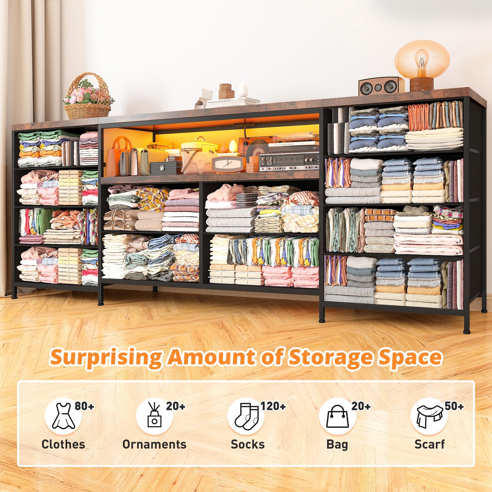 - 【Safety Power Outlet & LED Lights】Equipped with 2 power outlet & 2 ports, so you can easily charge your TV and other media devices without the need for extra extension cords. This long dresser for bedroom is equipped with 21 colors, 22 dynamic modes, 10 flicker frequencies, and 5 brightness grades, which can be controlled by remote control, you can freely adjust the brightness and colors for any scene to enhance the atmosphere of your room. The led lights work flawlessly with remote, which offers a nice ambiance. In addition, this lights can also serve as a night light to illuminate for you when you wake up at night