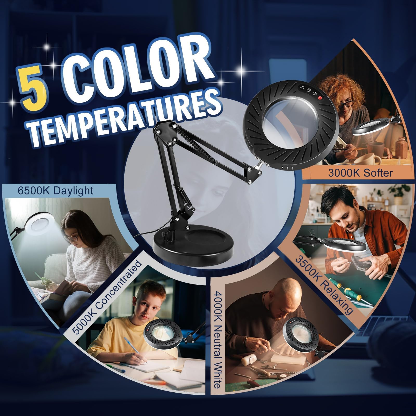 - 【5 Color Modes & 10-Level Brightness】This magnifying lamp features adjustable color temps and brightness, ideal for low vision needs. The desktop magnifying glass with light has convenient head-mounted controls - no bending needed. Perfect for reading and detail work, this lighted magnifying glass with stand delivers comfortable, glare-free illumination.