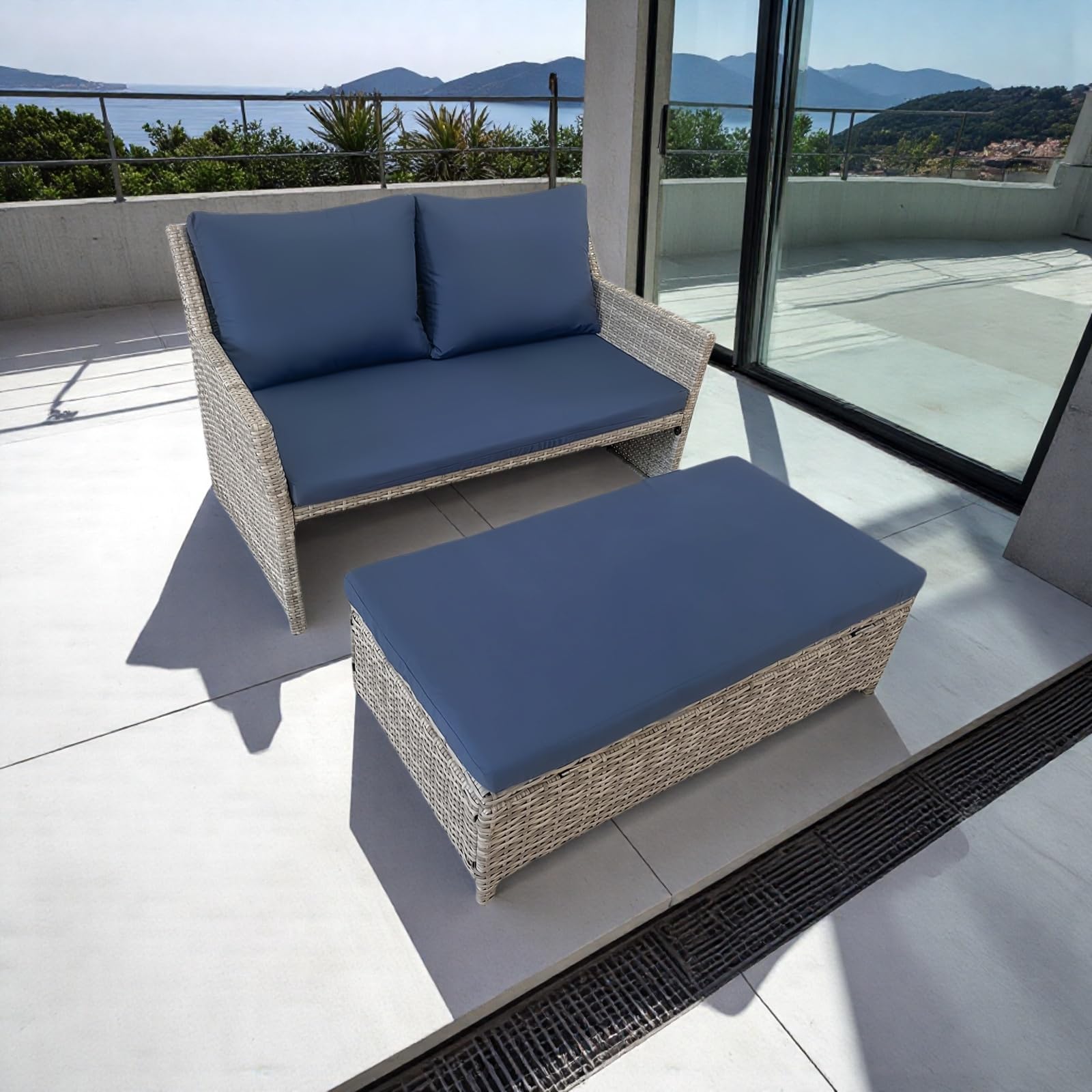 2 Piece Patio Sofa, Outdoor Patio Loveseat with Built-in Storage Bin, Wicker Couch with Coffee Table, for Balcony,Porch,Pool (Grey-Blue)