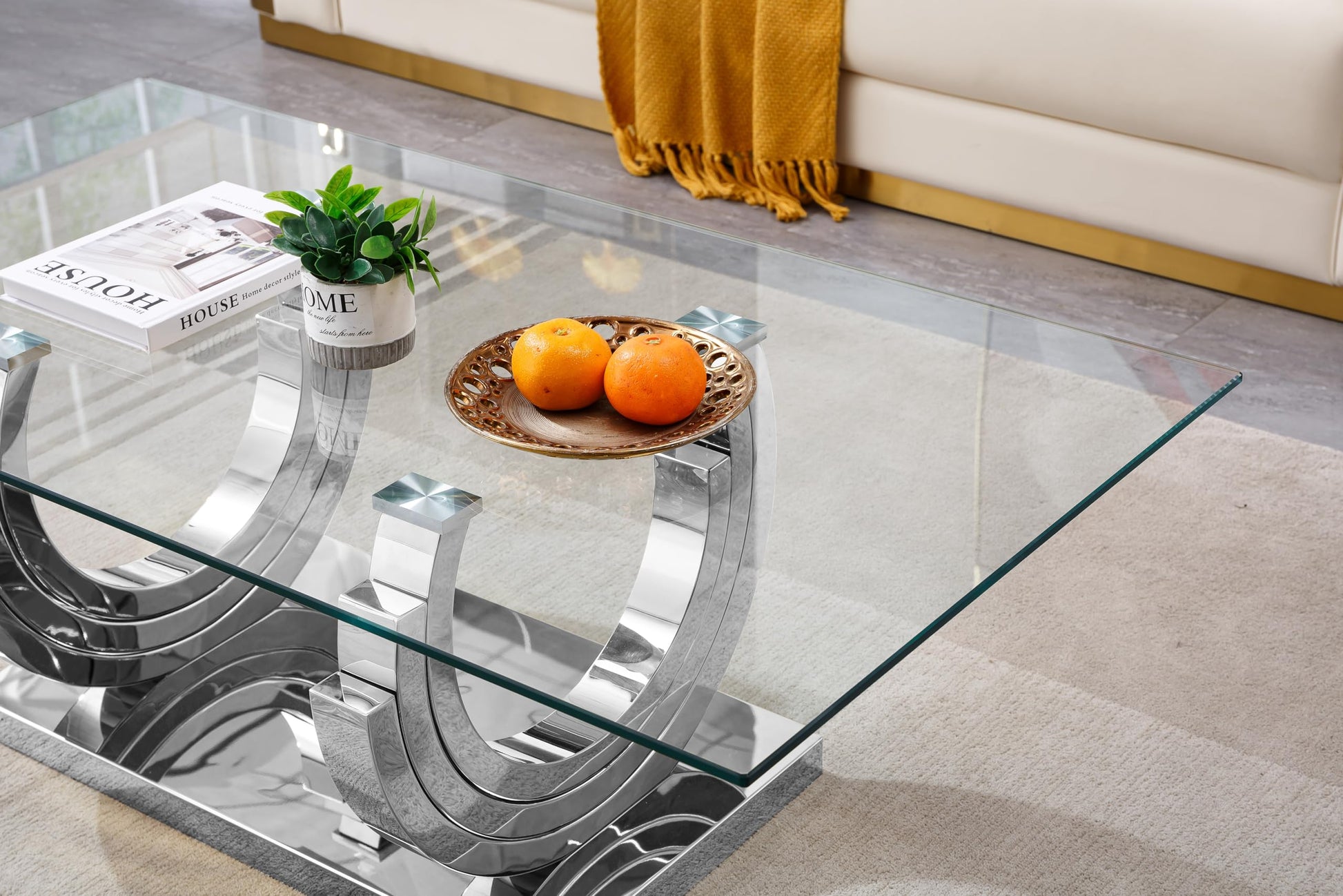 Details: Bring a beautiful touch of modern to your home with the unique coffee table/sofa table /end table. With tempered glass top and unique geometric stainless steel frame, this living room table is designed to stand out in your home. Stainless steel and glass are easy to clean and durable for beauty that will last.