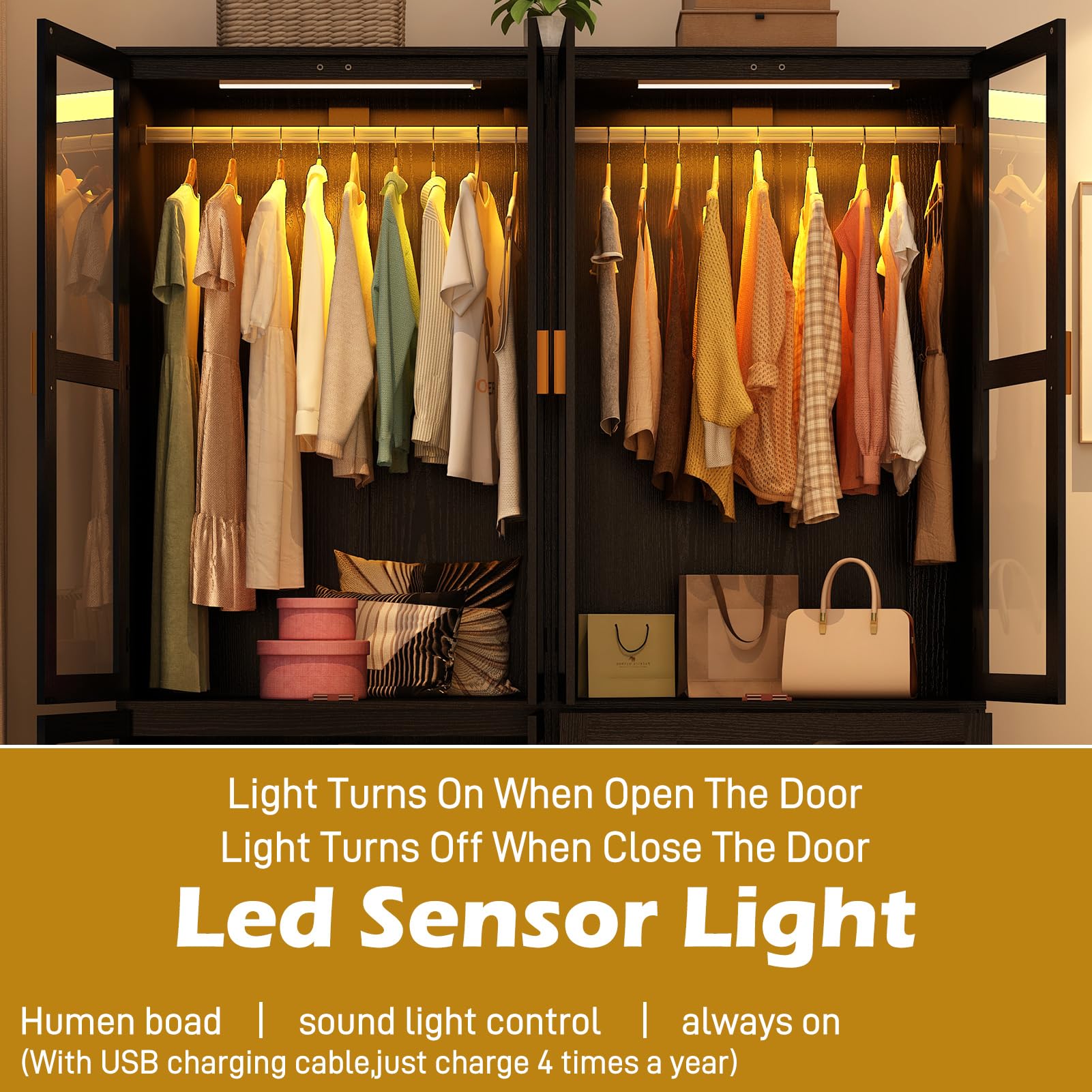 - Armoire Wardrobe Closet with LED:this 71' freestanding wooden wardrobe closet cabinet for bedroom Equipped with human body intelligent induction light, the door light turns on when opened and turns off when it is closed the door. The induction range is within 5 meters, so you can easily find clothes at night.The LED light is charged via the included USB charging cable and can be used for 3-5 months on a single charge.
