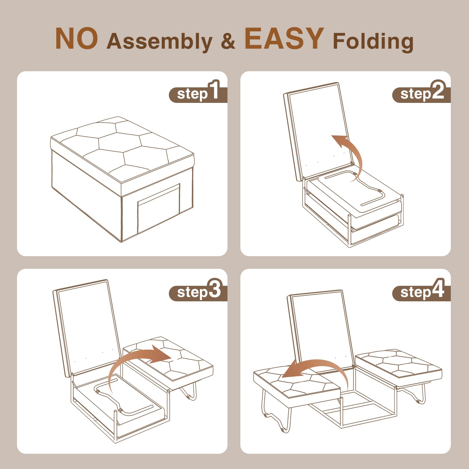 - No Assembly and Easy Convertible. This convertible chair is ready to use upon receipt and is suitable for people of all ages; in addition, this 4-in-1 sleeper can be easily converted into four forms: ottoman, sofa chair, recliner or bed