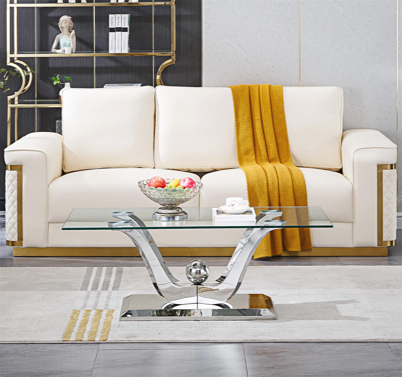 - Coffee table features tempered glass tabletop and unique mirrored stainless steel legs, it is durable and stylish.