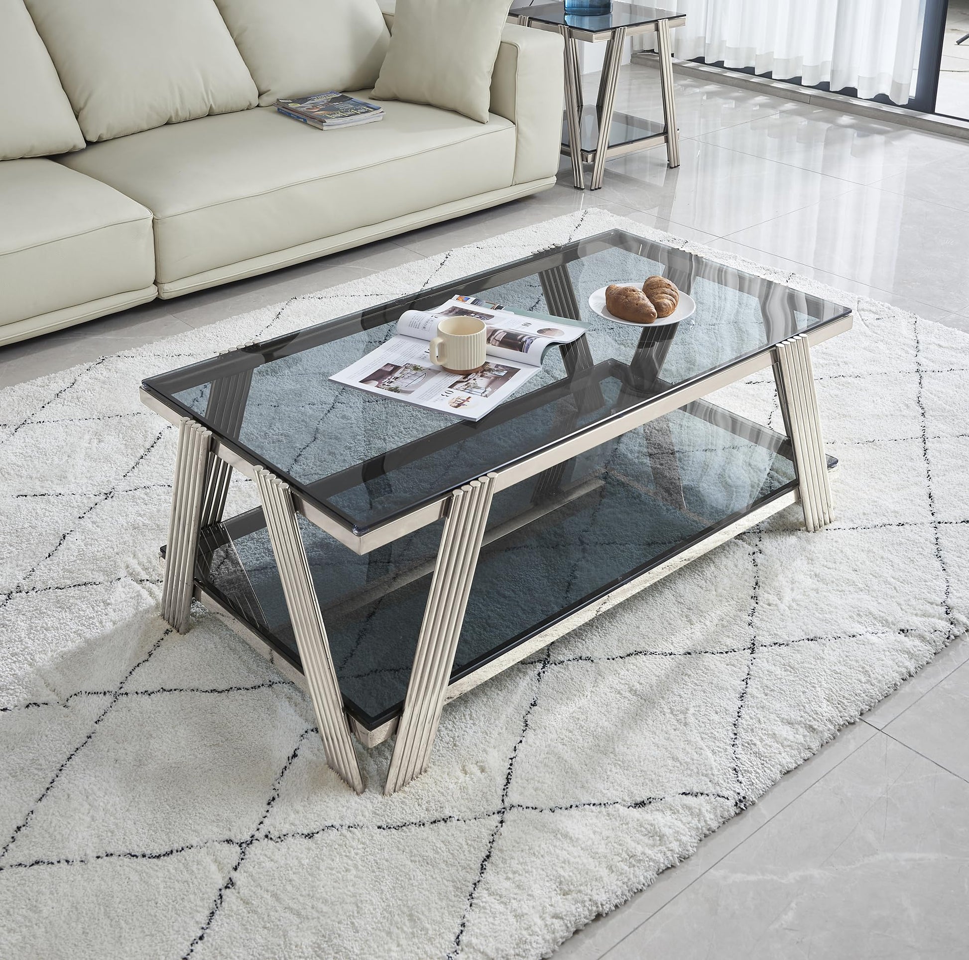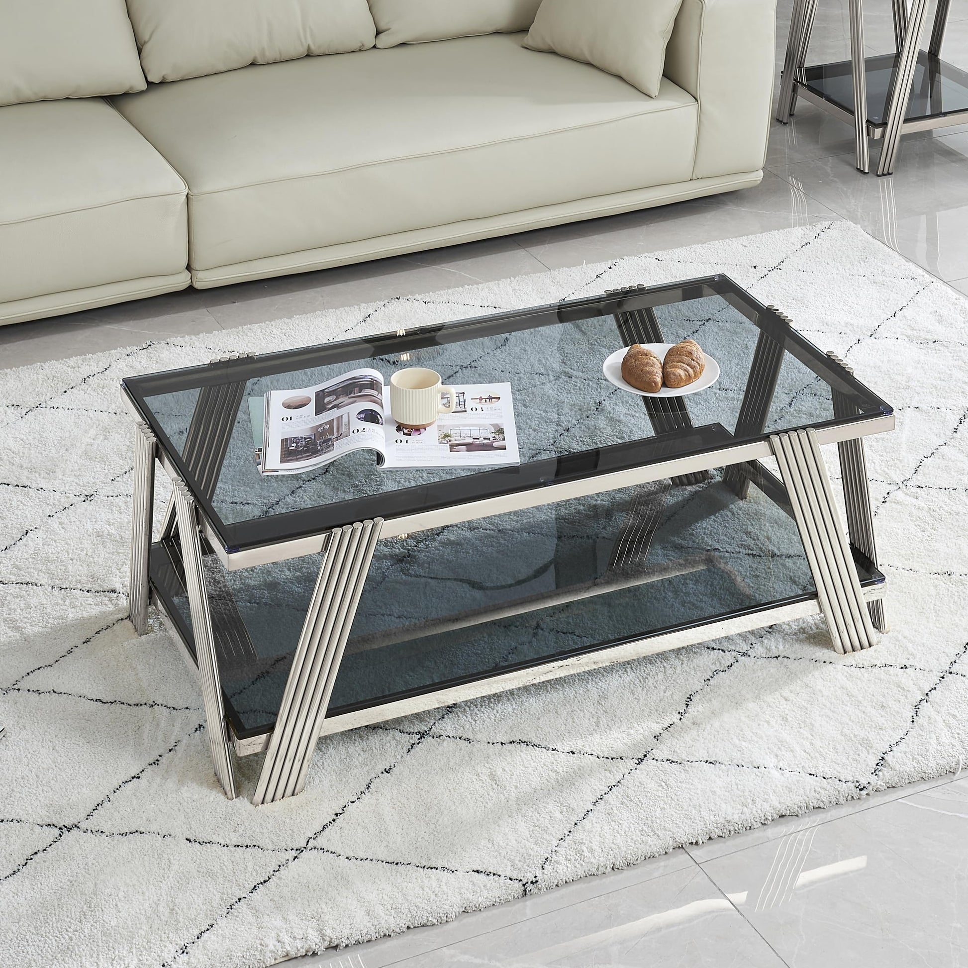 47" Modern Coffee Table, Double-Layer Black Tempered Glass Table Top with Stainless Steel Frame, Center Table with Storage, for Living Room Home Office, Silver