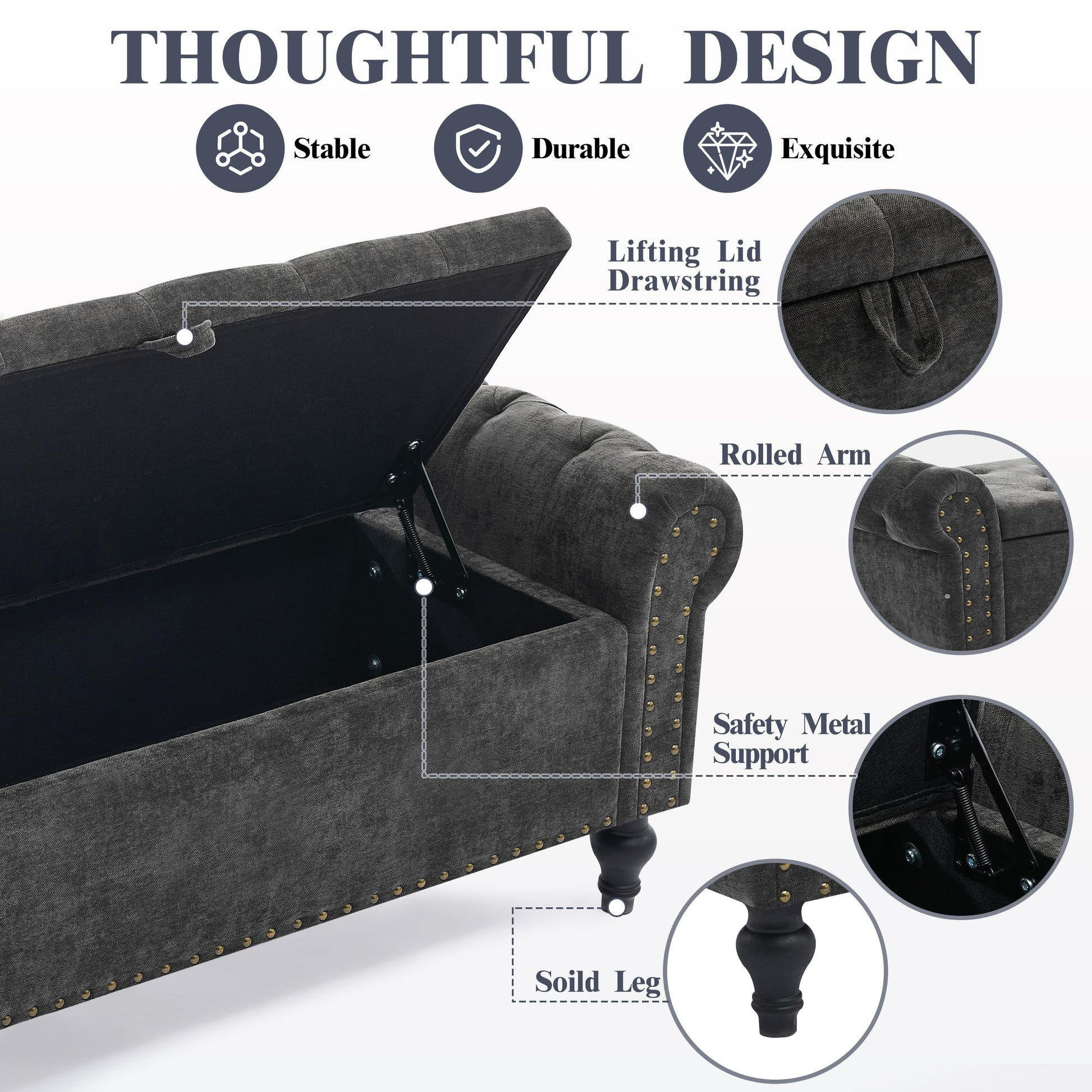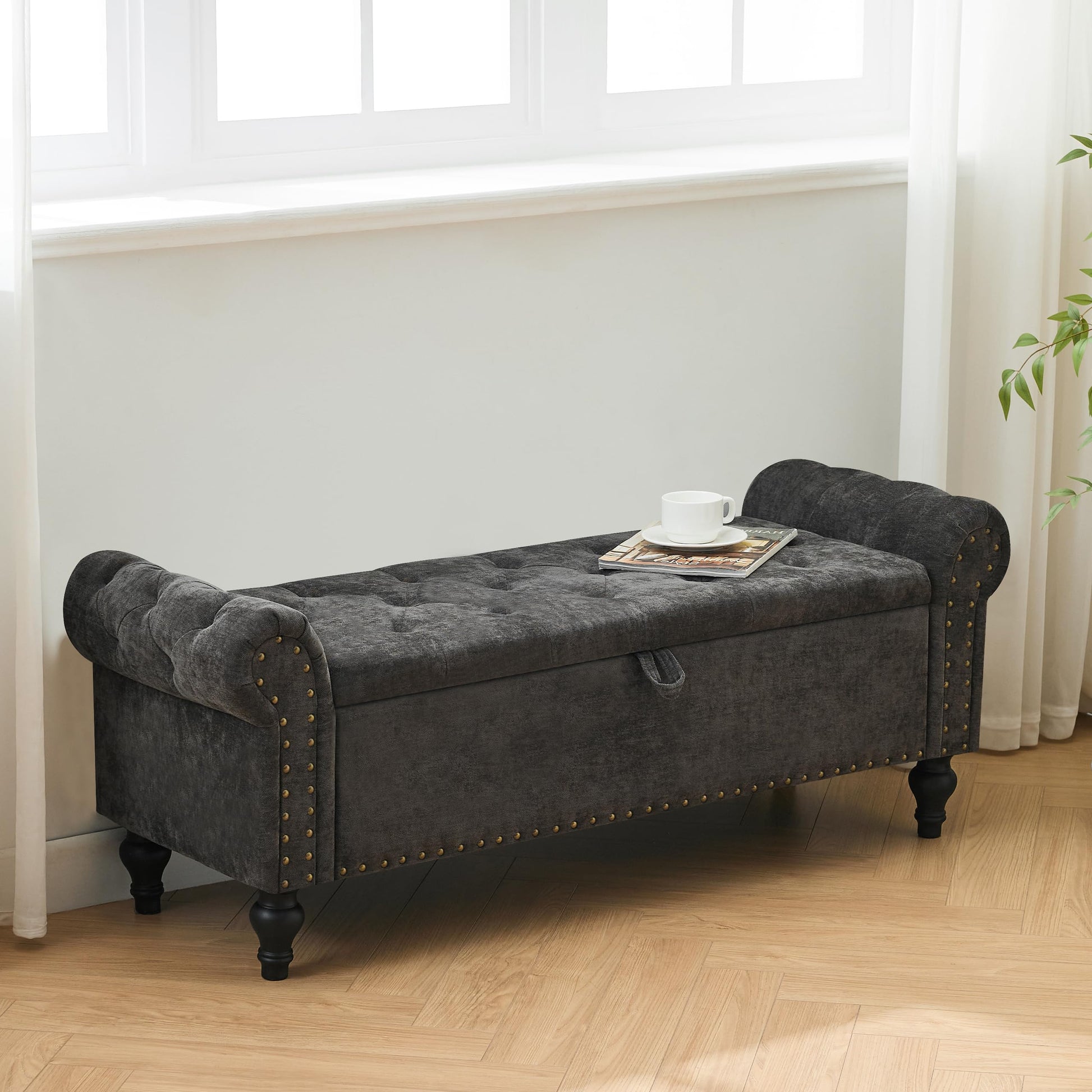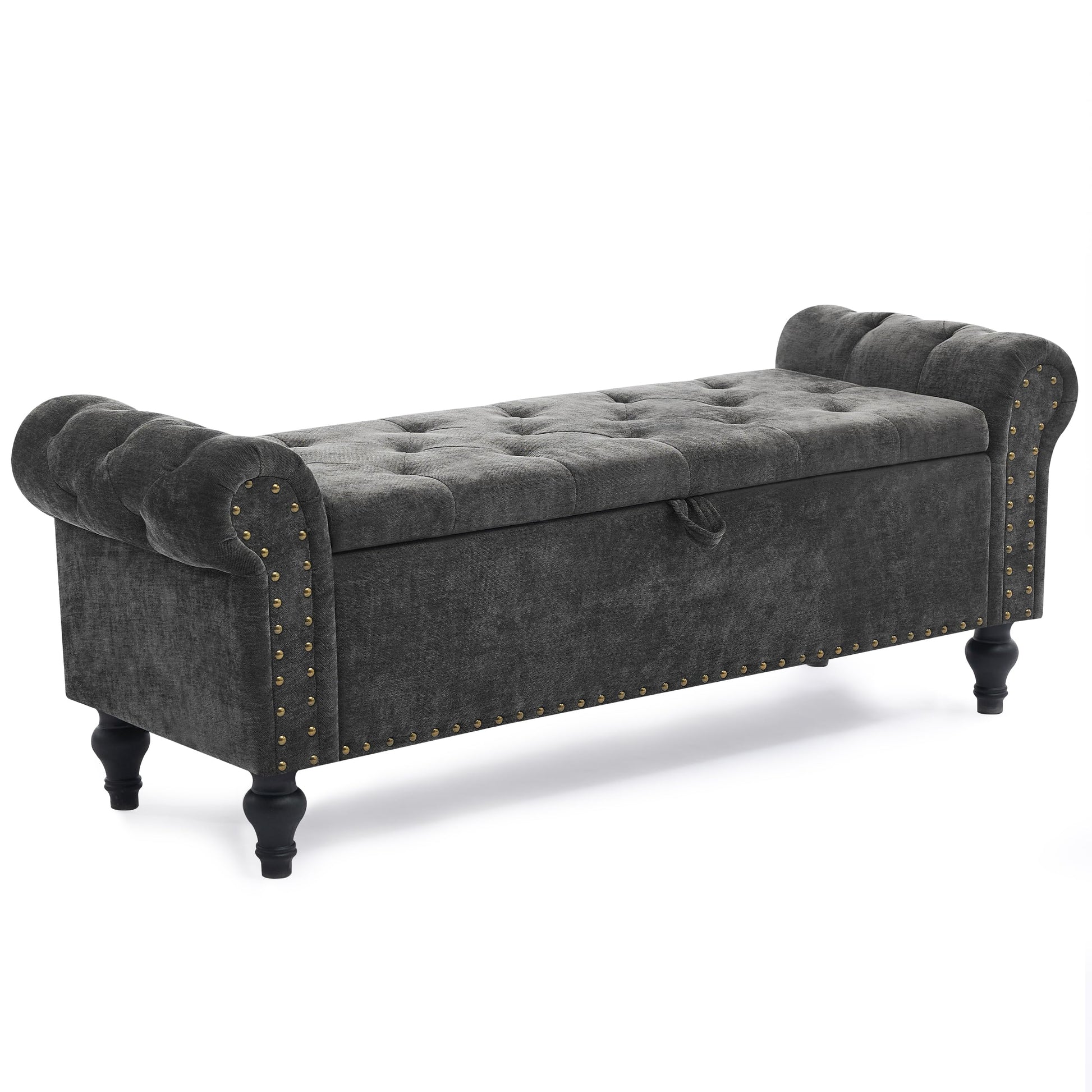 51" Bedroom Storage Bench, End of Bed Bench with Storage, Chenille Upholstered Benches, Ottoman with storage, Window Benches with Rolled Arm and Nailhead Trim for Living Room, Entryway, Dark Gray