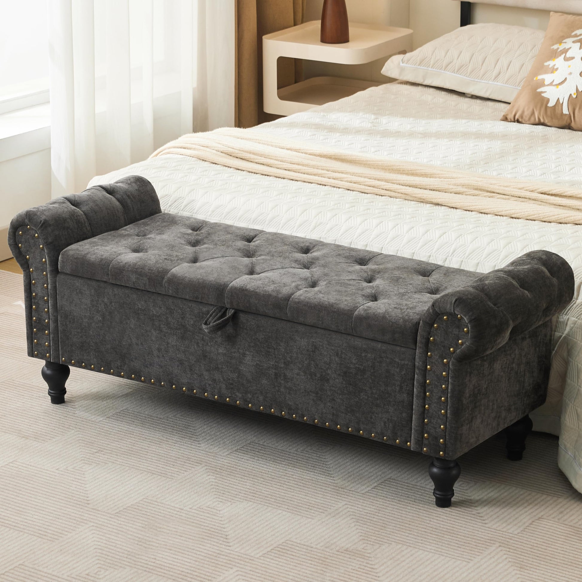 - STYLISH & ELEGANT DESIGN: This end of bed storage bench combines modern minimalism with refined decorative details, featuring button tufting, and rolled arms accented with nail head trim. Its sophisticated look adds a touch of elegance to your room