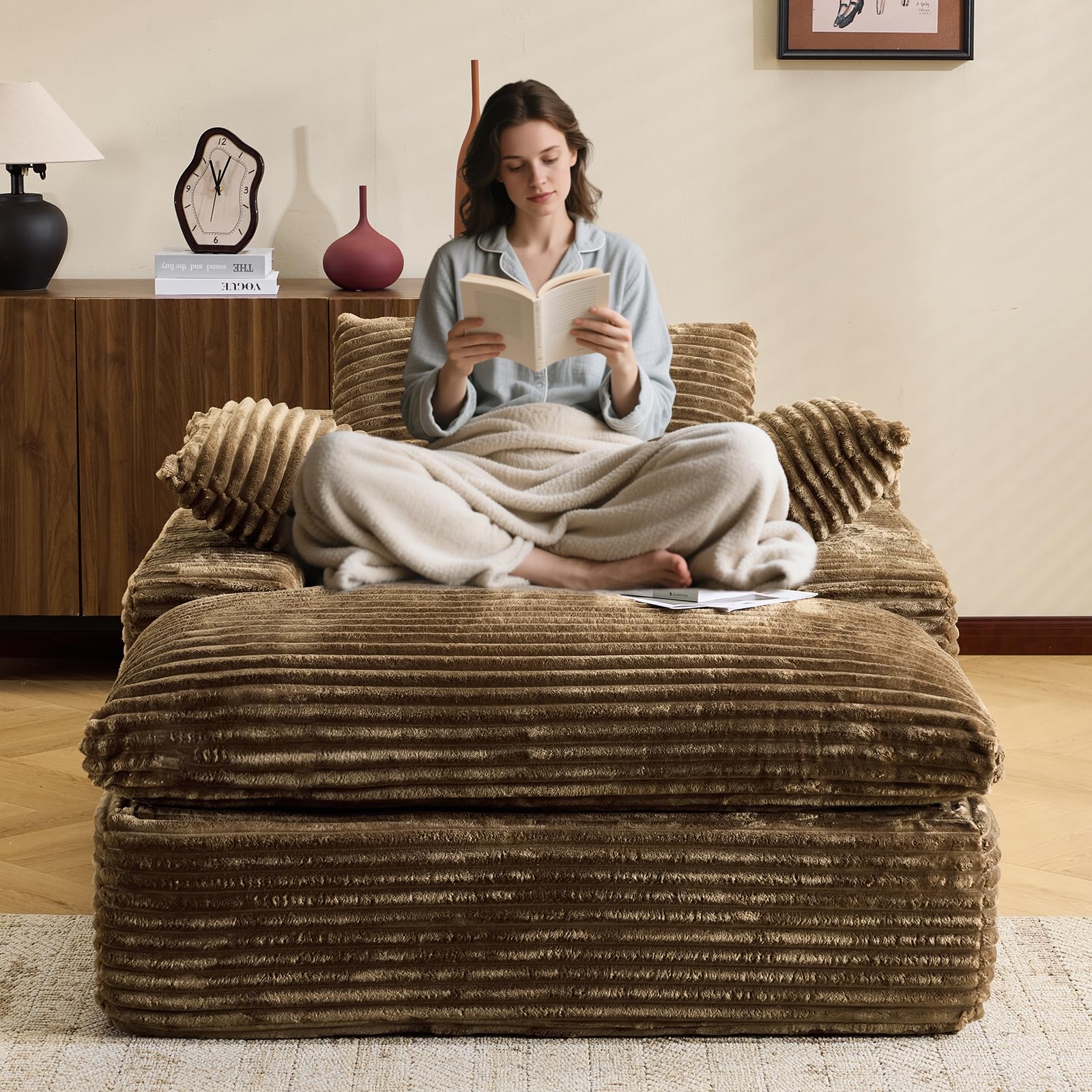 67" Boneless Chaise Lounge Chair Indoor, Oversized Corduroy Upholstered Sofa Bed, Deep Seat Sleeper Couch Reading Chairs Cloud Sofas Couches for Living Room Bedroom, No Assembly Required, Brown