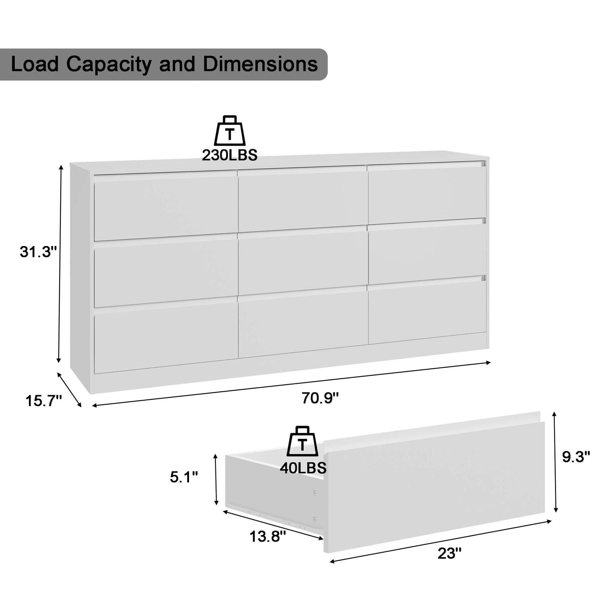 - 【Spacious Storage Space】 This modern drawer dresser comes with 9 spacious storage drawers, each with a depth of 5.1', allowing you to store plenty of clothes, blankets, books or other personal items, keeping your home tidy! The large tabletop measures 70.9' x 15.7', providing enough space for displaying photo frames, vases or table lamps.