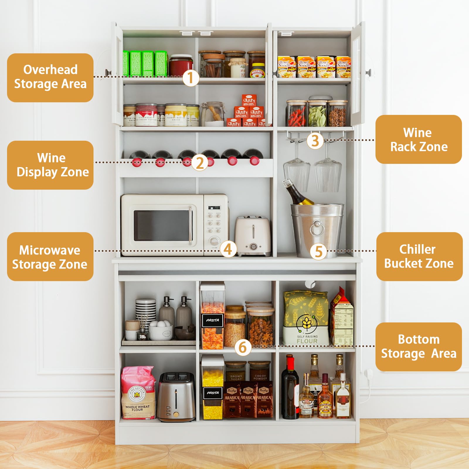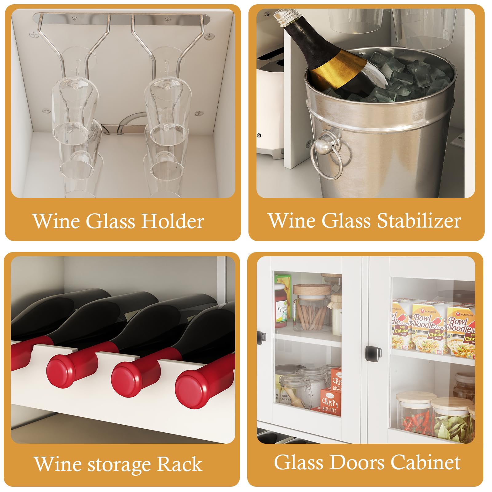 - ๐๐๐ซ๐ฌ๐๐ญ๐ข๐ฅ๐ ๐-๐ข๐ง-๐ ๐๐ญ๐จ๐ซ๐๐ ๐ ๐๐จ๐ฅ๐ฎ๐ญ๐ข๐จ๐ง - โ Top Cabinet with Mirrored Tempered Glass Doors which allow you to store and display your favorite items while adding a touch of sophistication.โกSpacious Middle Section with Built-In power outlet- At 15.7 inches deep, this section offers ample room for small kitchen appliances. Plus, enjoy dedicated storage for 6 wine bottles and a stemware rack (capacity varies by base width).โขSliding Barn-Style Door Bottom Cabinet-Smooth-gliding barn doors make accessing items a breeze while adding rustic charm. Adjustable dividers on both top and bottom shelves let you customize storage to fit your needsโeach shelf holds up to 50 lbs.