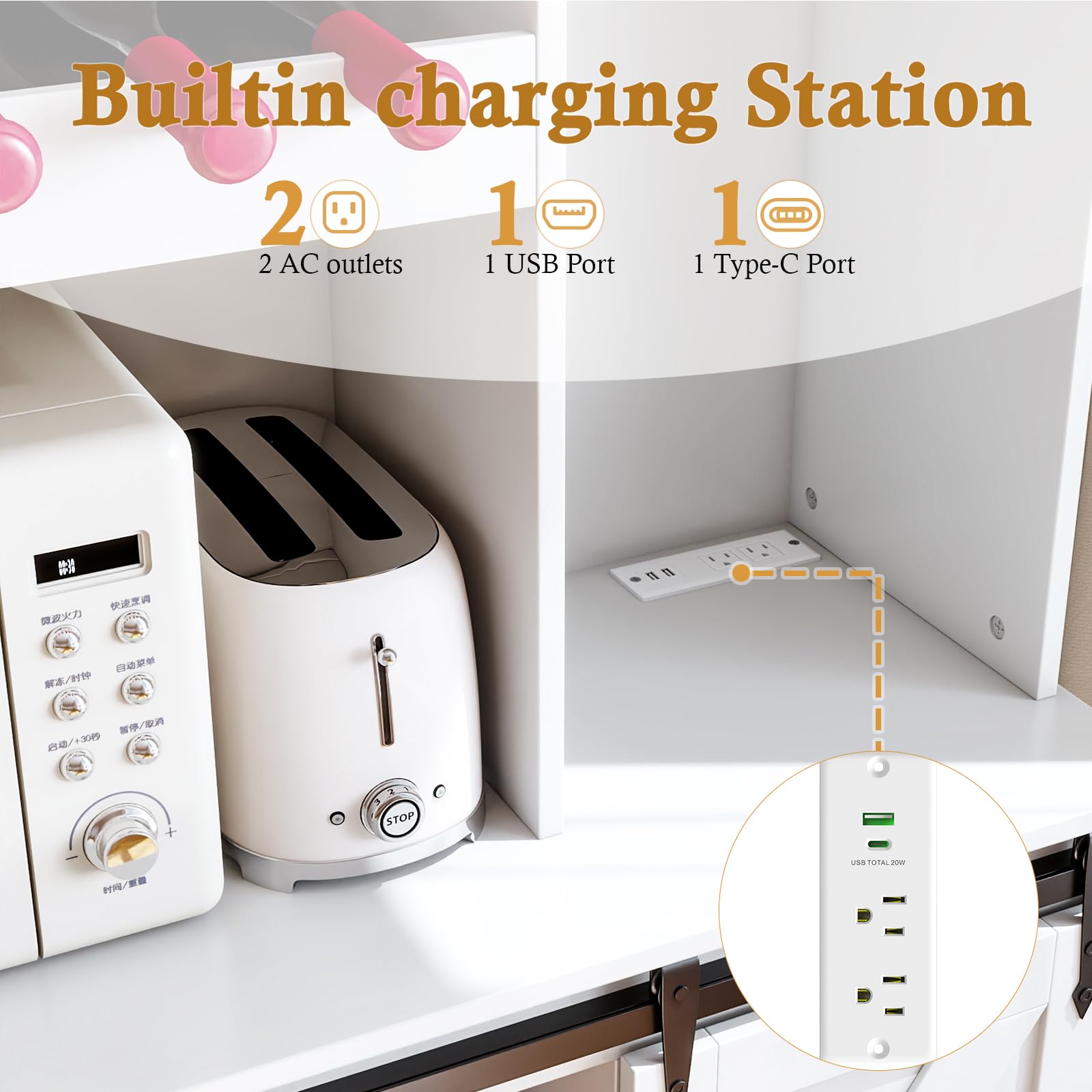 71" Kitchen Pantry Storage Cabinet with Charging Station, Farmhouse Coffee Bar Cabinet with Adjustable Shelves, Tall Hutch Cabinet with Microwave Stand & Wine Rack for Kitchen, Living Room (White)