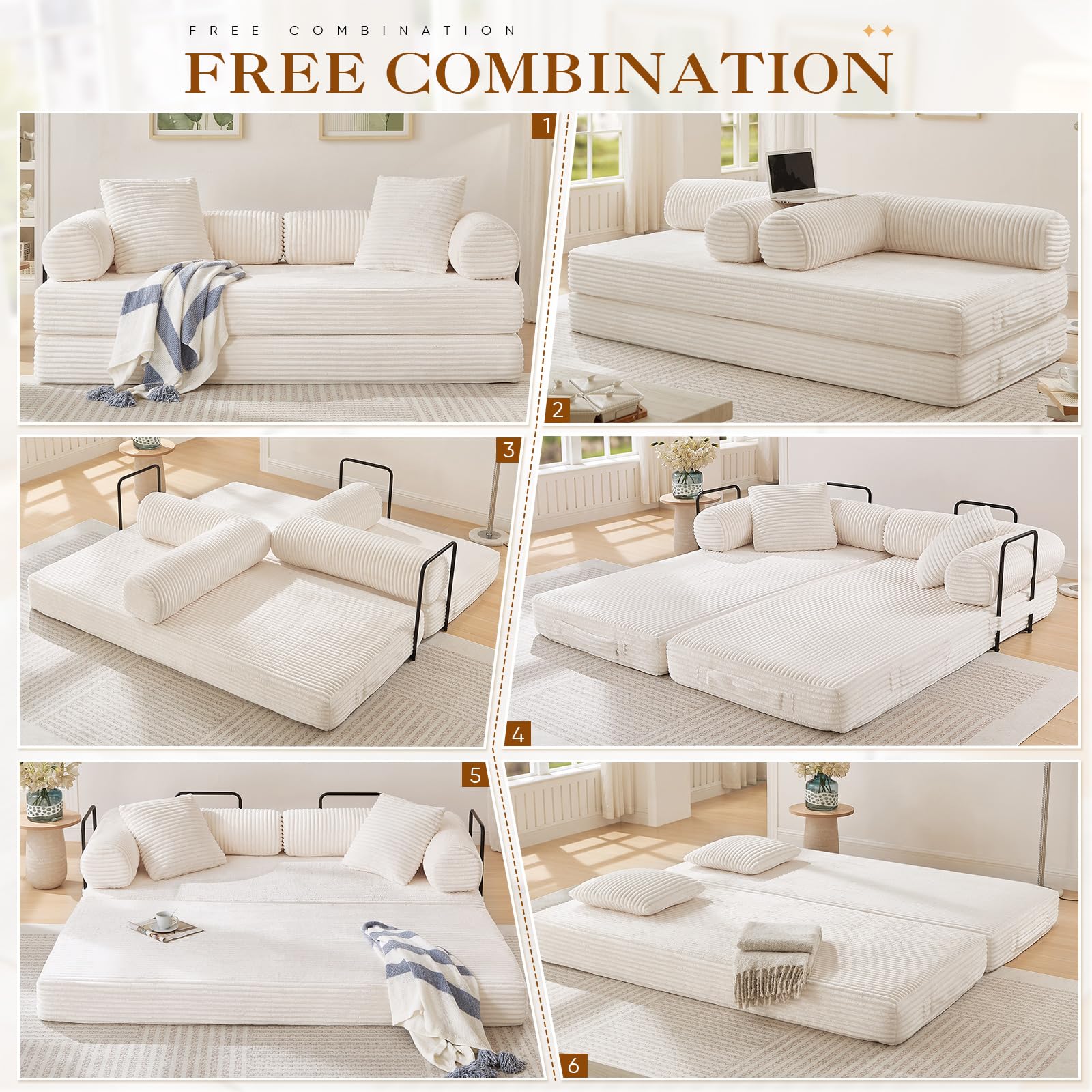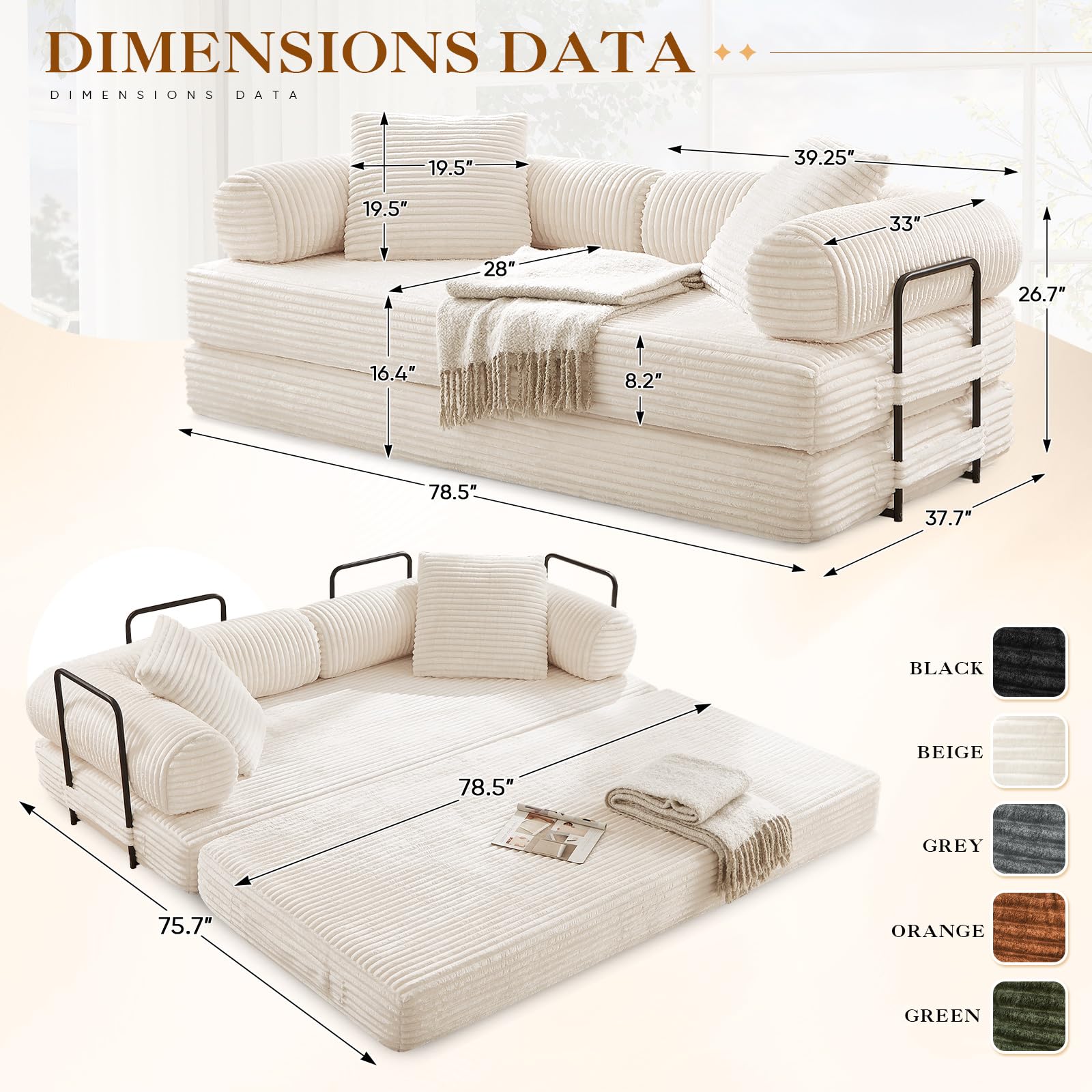 78.5"W Convertible Folding Sofa Bed, Corduroy Upholstered Queen Size Foam Floor Couch with Fixed-Shaped Frame, Loveseat Sleeper Compression Sofa Foldable Mattress for Living Room, Bedroom(Beige)