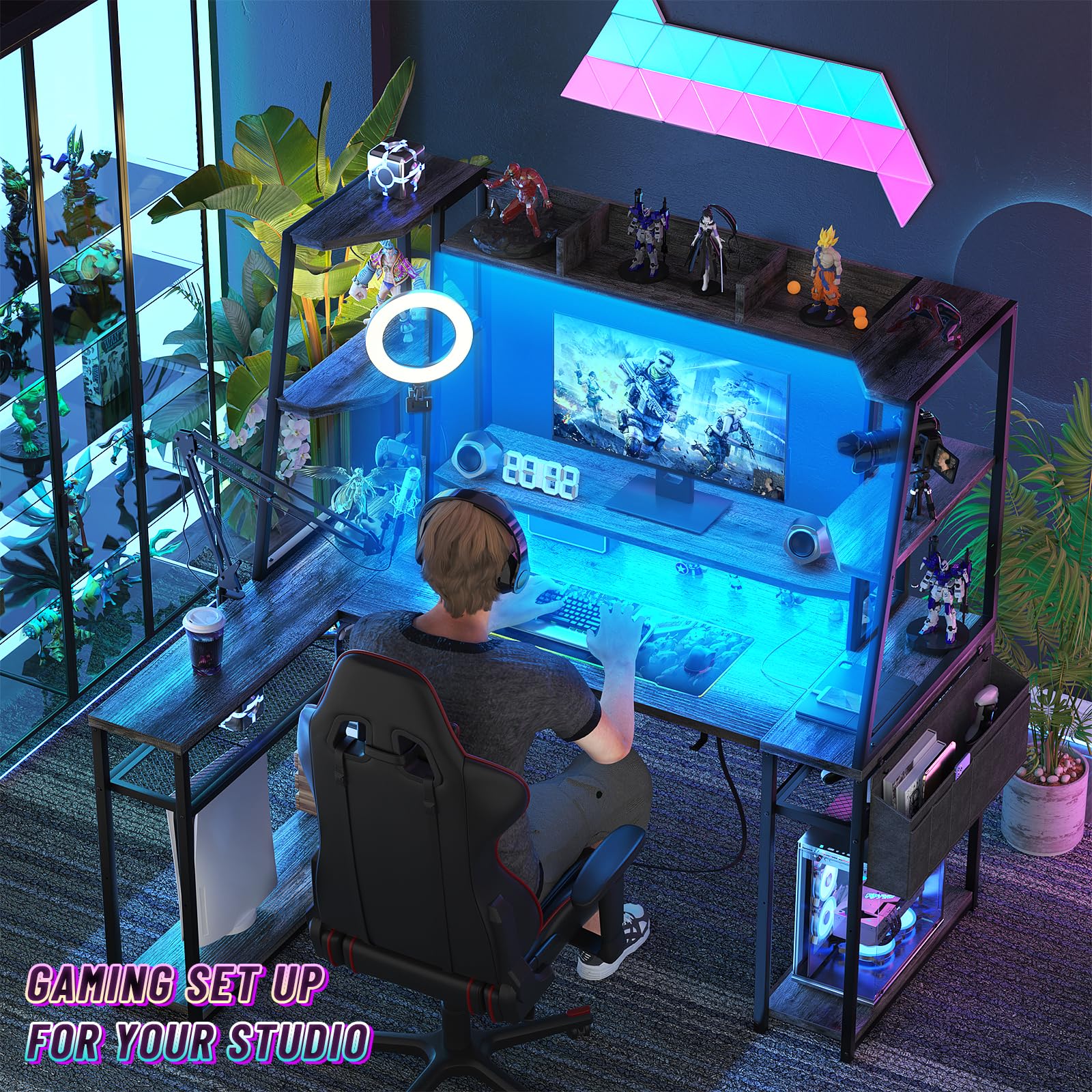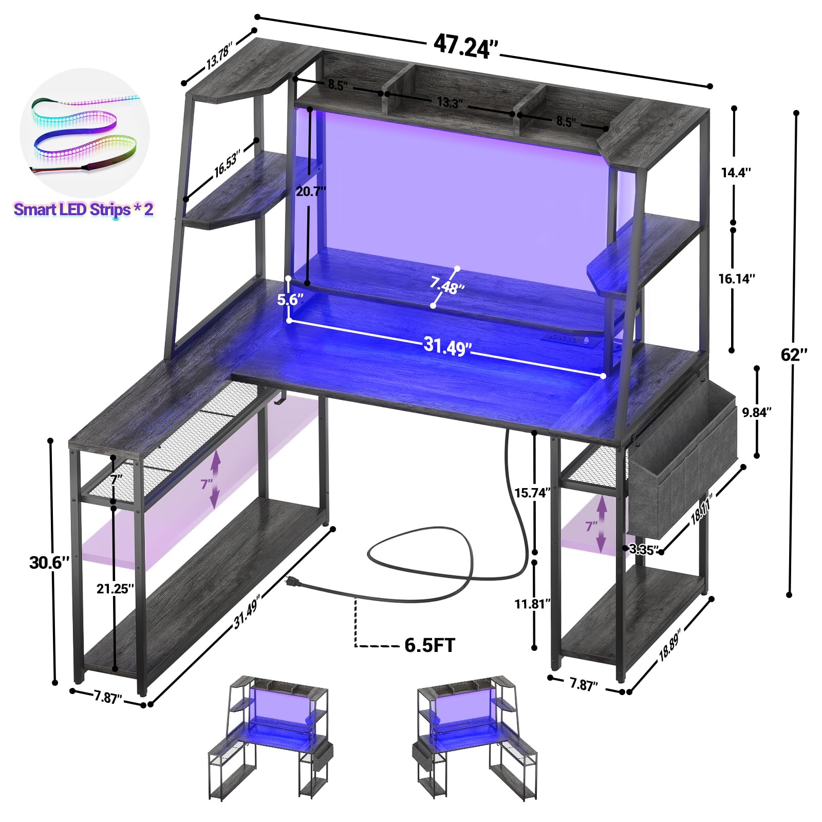 armocity L Shaped Gaming Desk with Hutch & Shelves, 47'' Gaming Computer Desk with LED Lights & Outlets, PC Gaming Desk with Storage & Monitor Stand, Grey Oak