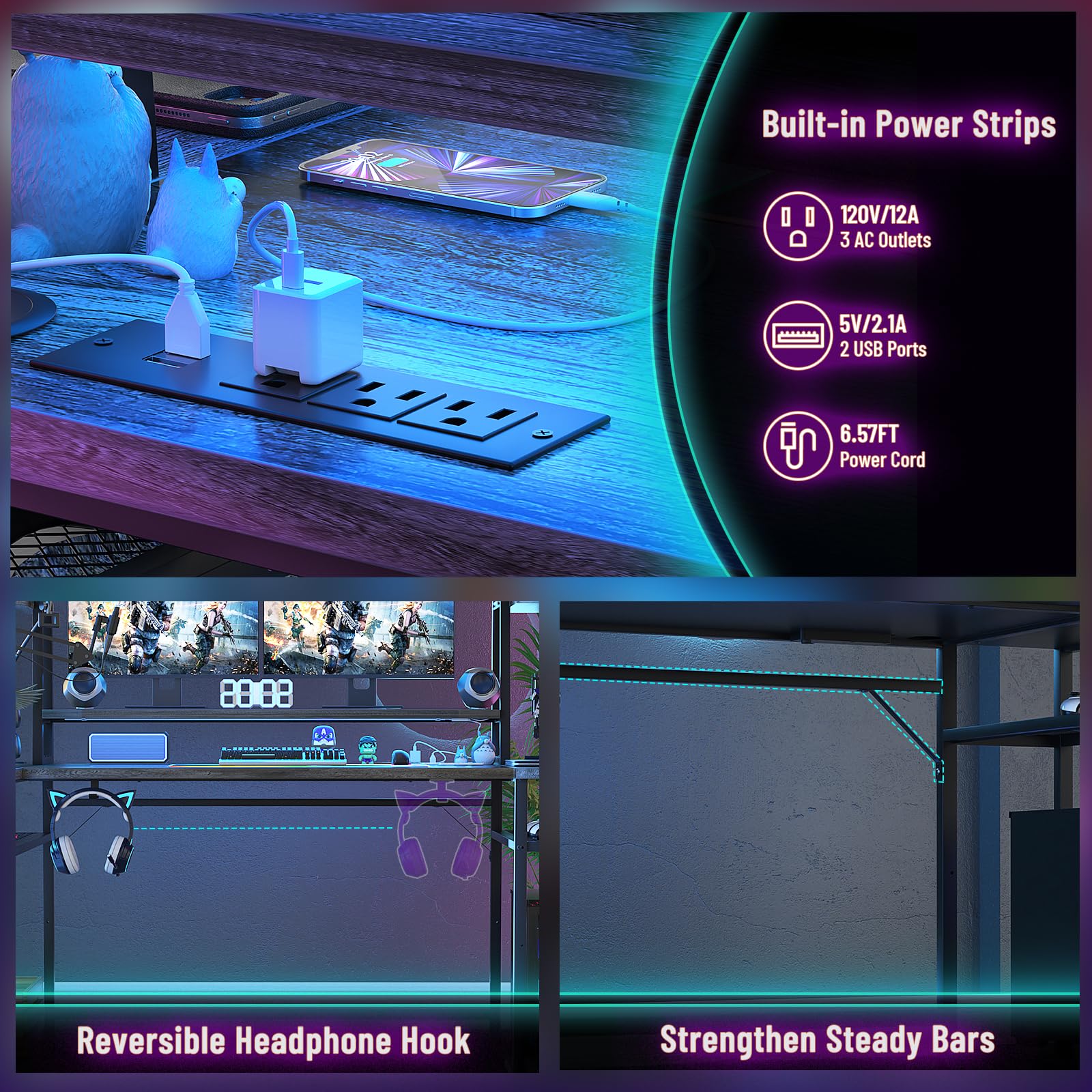 - Gaming Desk L Shape with Outlets - With extra power outlets and USB connectors built into the desktop, this computer desk will make your setup even more convenient. It's handy and could help to charge your multiple gaming systems. Good to place your monitors, speakers, mic, mouse & keyboard.