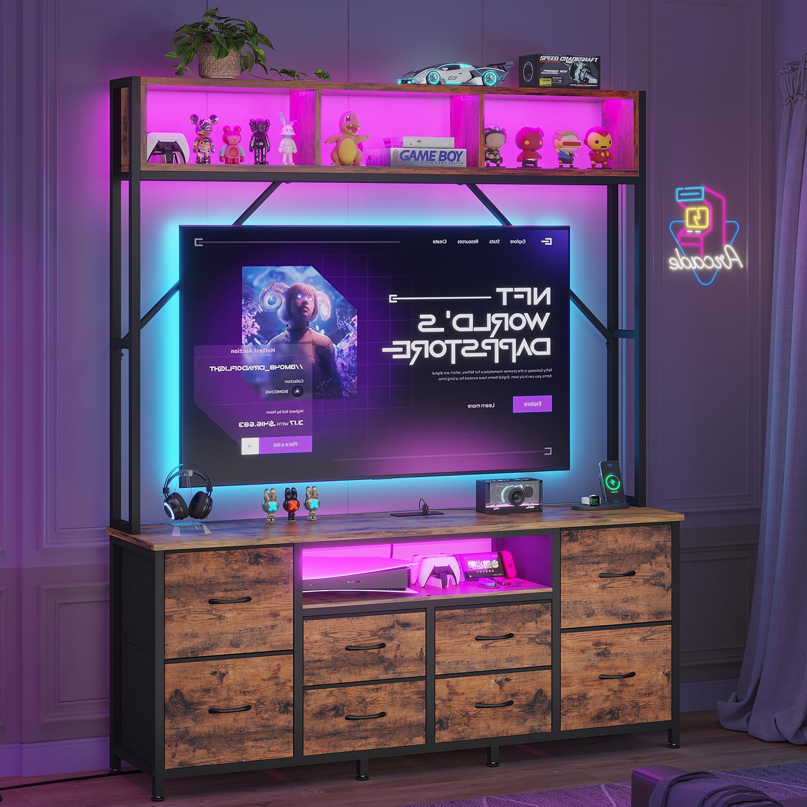 - TV Stand with Ample Storage Space: This tv stand equiped with 6 spacious folding fabric drawers and ample open storage shelf provides you neatly organized your books, clothing, toys, games goods and store your media accessories, blankets, and other essentials. The roomy open shlves with smart LED lights strips for placing your favorite game figurines, picture frames, flowers and cute decorations.