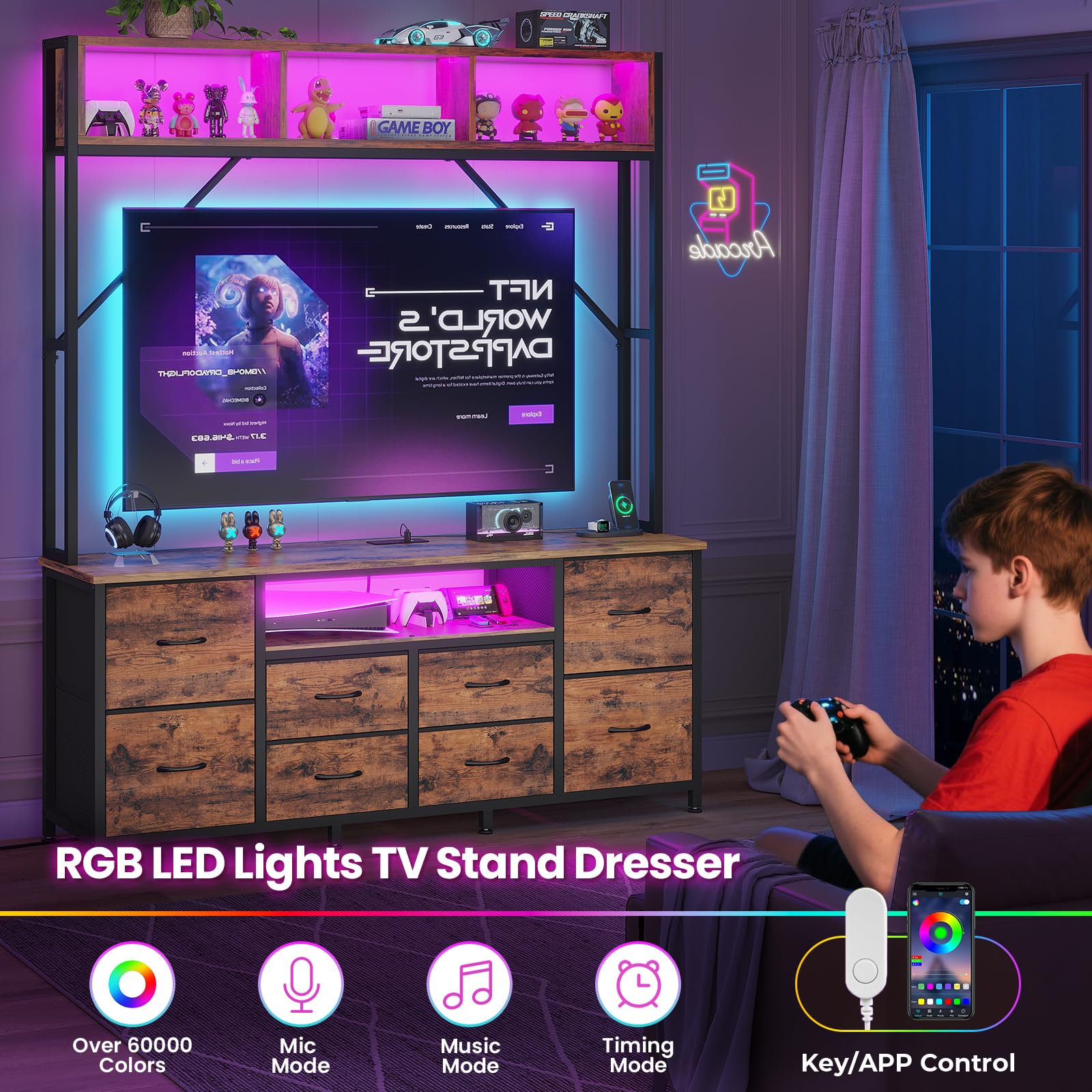 BTHFST 55" TV Satnd for Bedroom Room, Wall Unit Entertainment Center with 2 LED Lights & Power Outlets, TV Stand Dresser with 6 PU Fabric Drawers & 4 Open Storage Shelves, Rustic Brown
