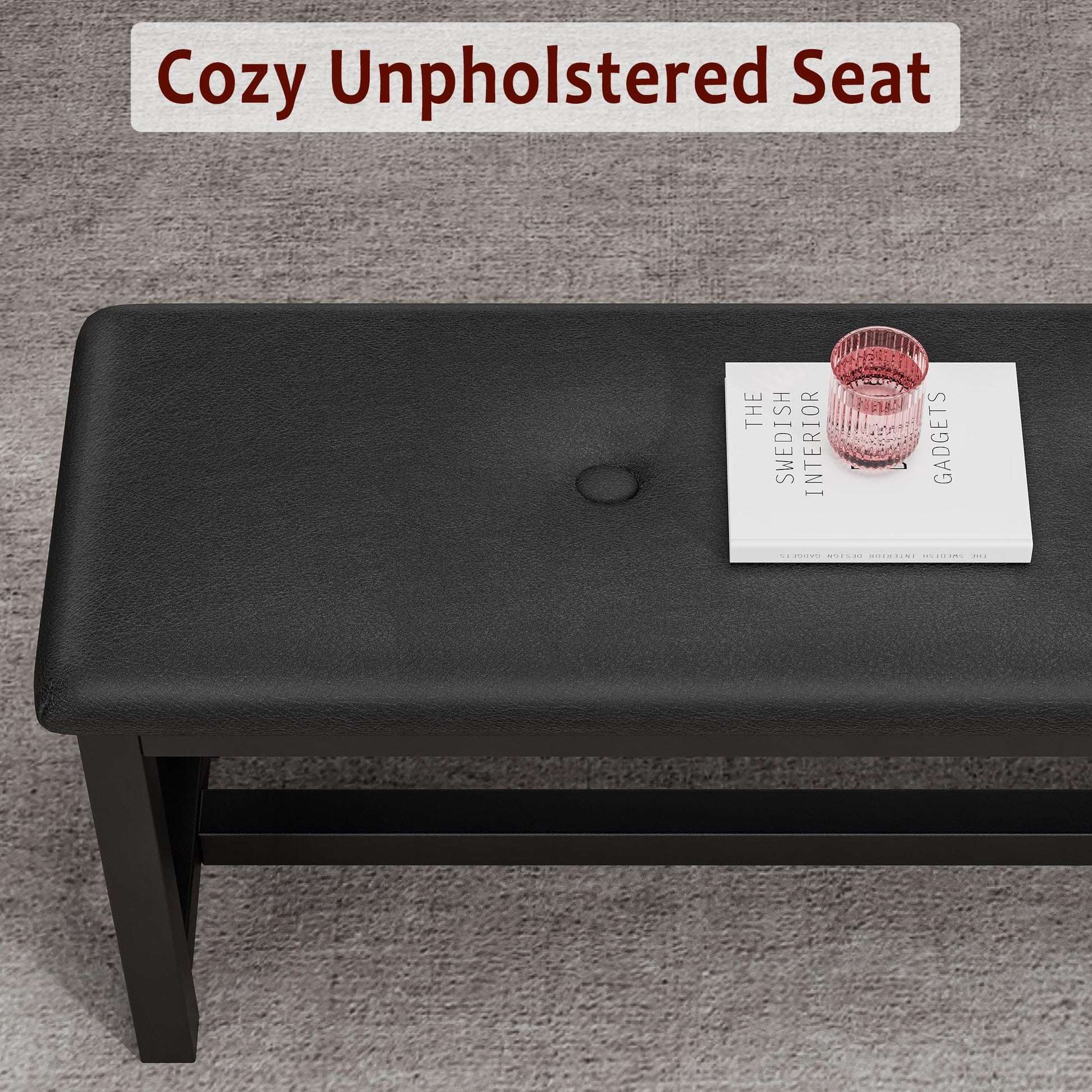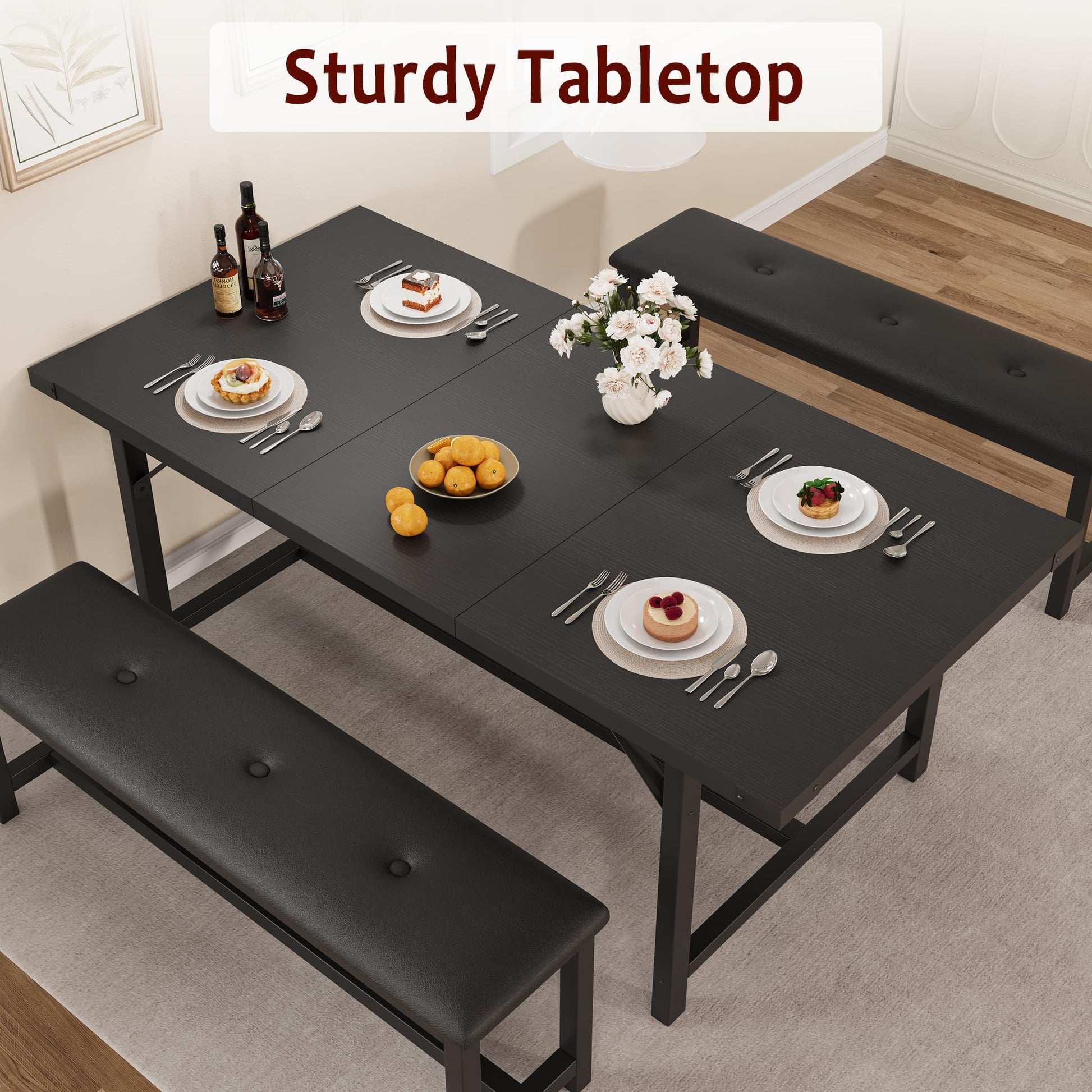 - 3. Comfortable and Low Maintenance: The MDF tabletop features a sleek, smooth surface that is easy to clean and maintain. The upgraded upholstered cushions on the two benches provide an added layer of comfort, enhancing your dining experience. Additionally, each corner of the extendable kitchen table set is reinforced with iron protectors to prevent damage from accidental bumps and collisions, significantly improving the durability of this extendable dining table bench set for 4-6