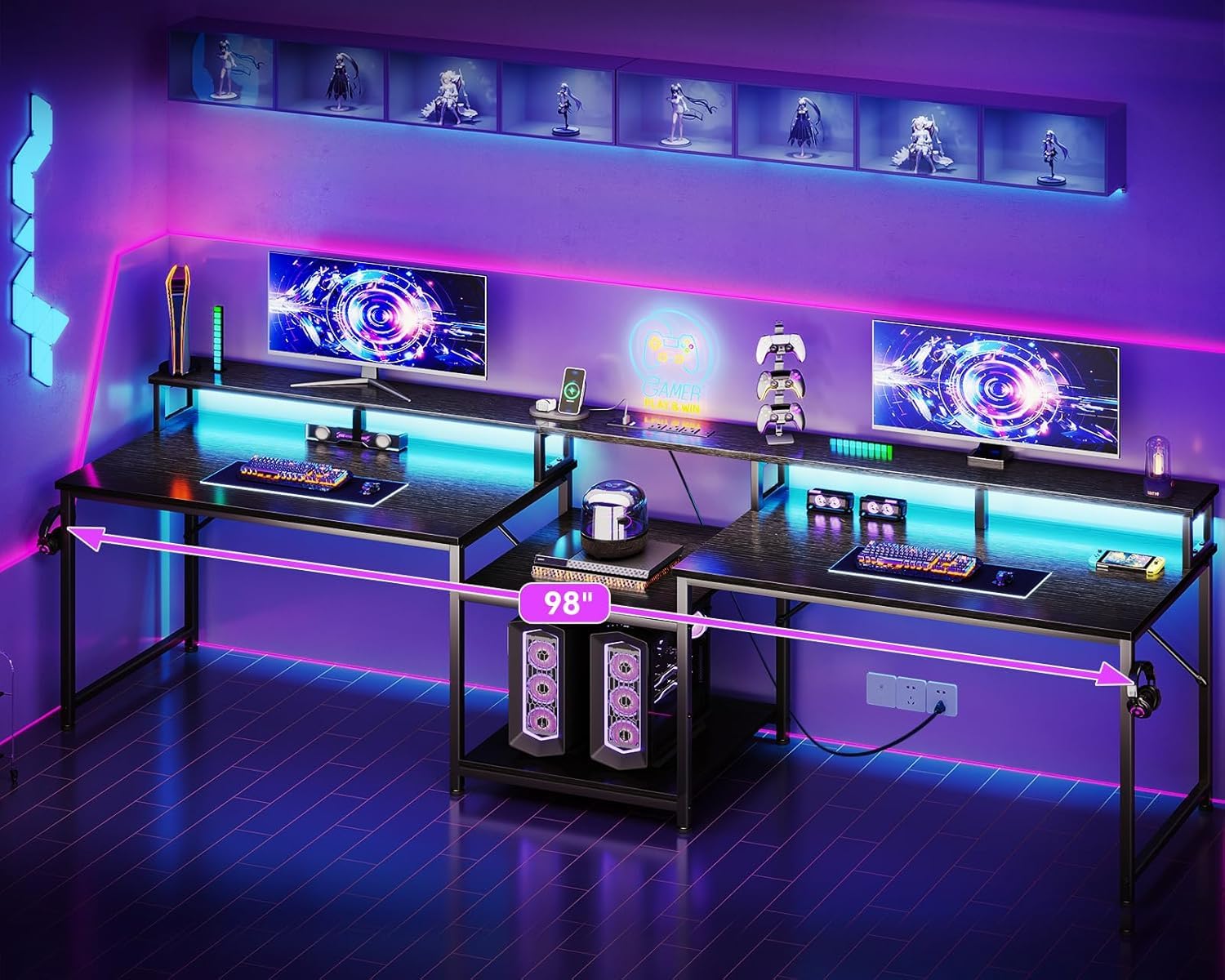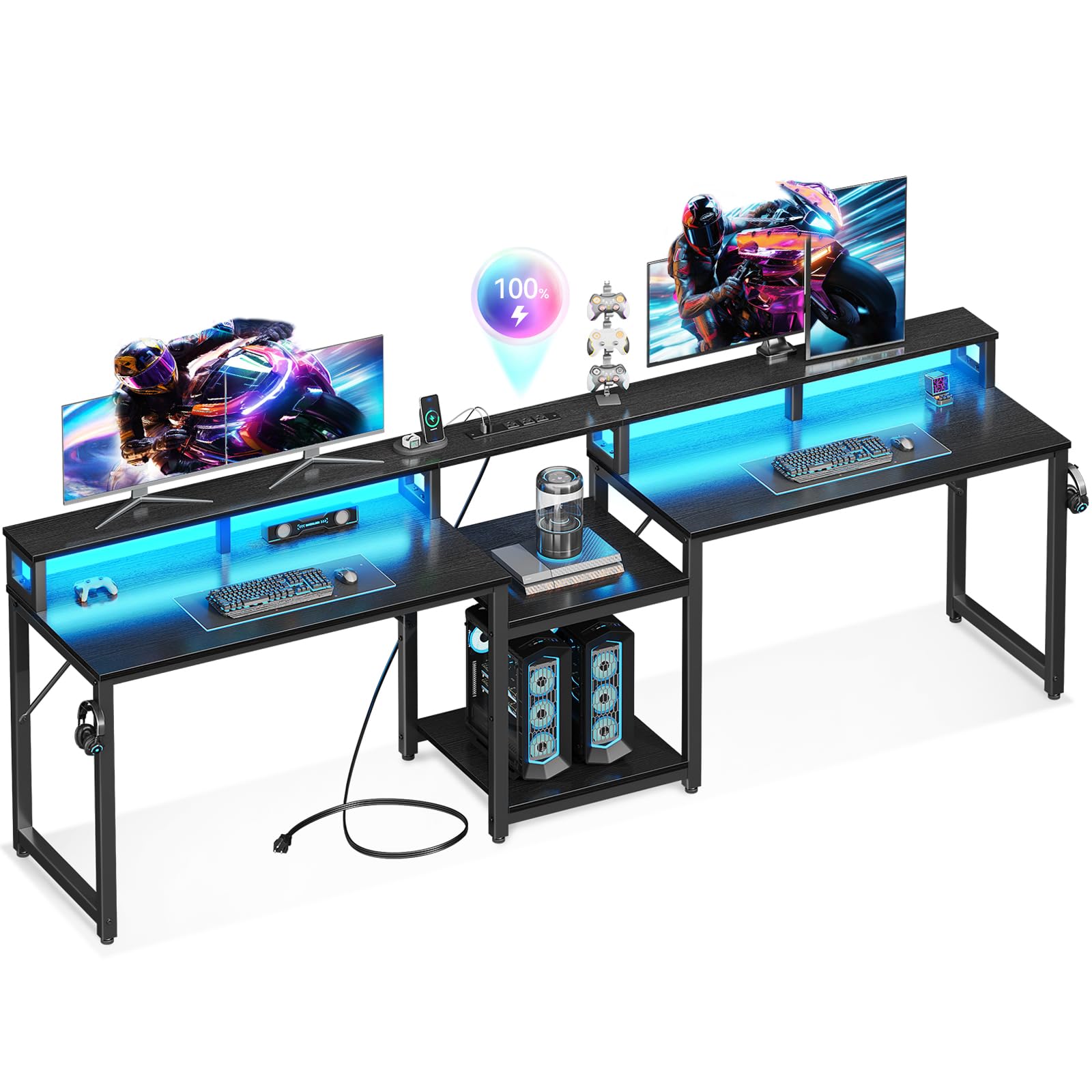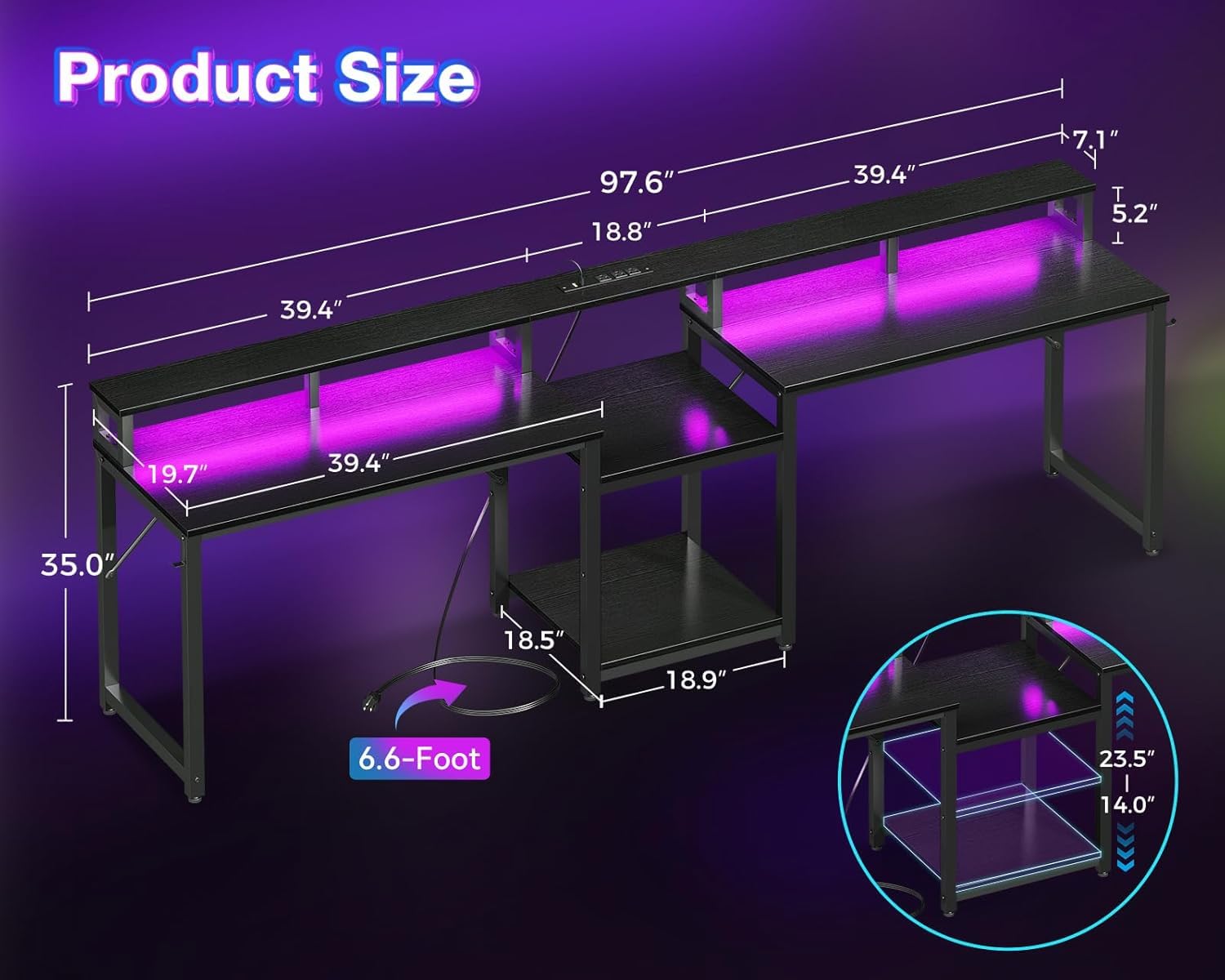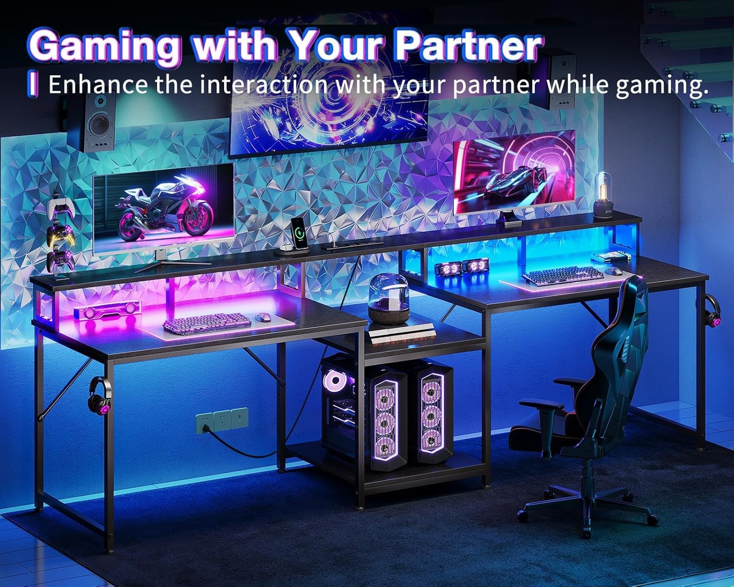 Casaottima 98 Inch 2 Person Gaming Desk with Storage Shelves, Long Double Home Office Computer Writing Desks with USB Charging Port & LED Lights, Monitor Stand, Modern Study/Work Table,Black