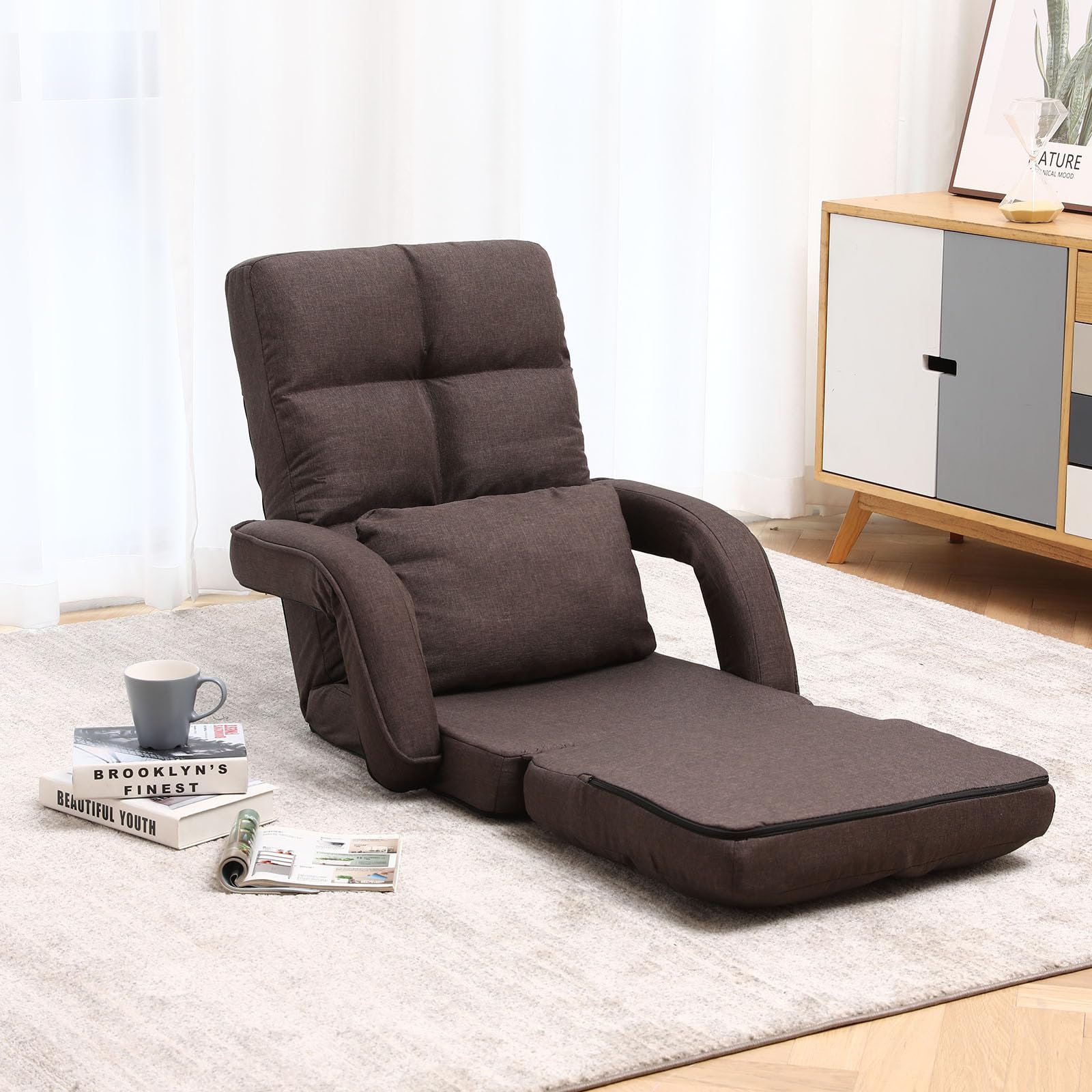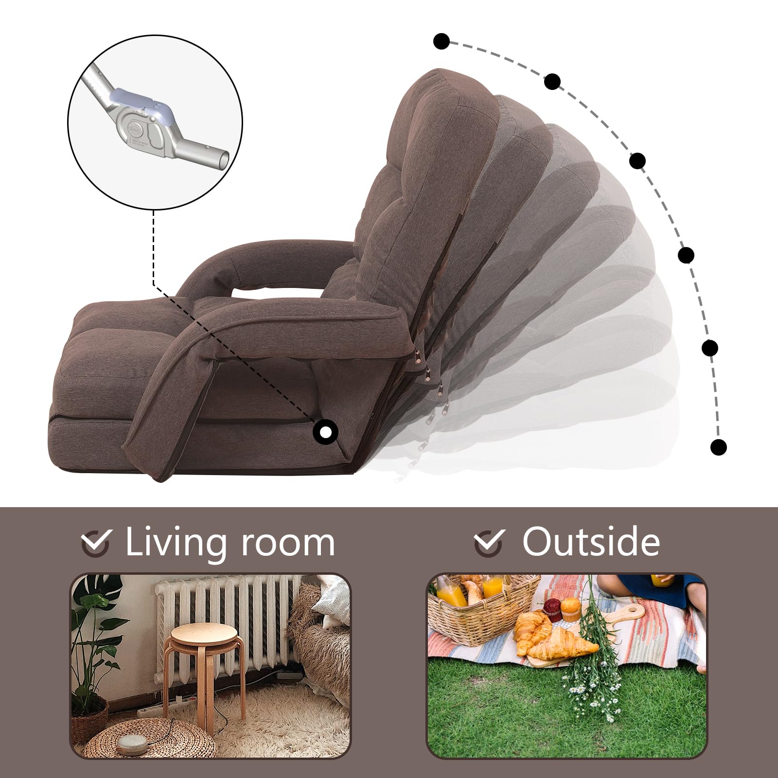 DeeLyan Indoor Floor Chair with Armrest and Pillow Folding Chaise Lounge Sofa 14-Position Adjustable Comfy Gaming Recliner Chair Padded Seats for Adults (Brown)