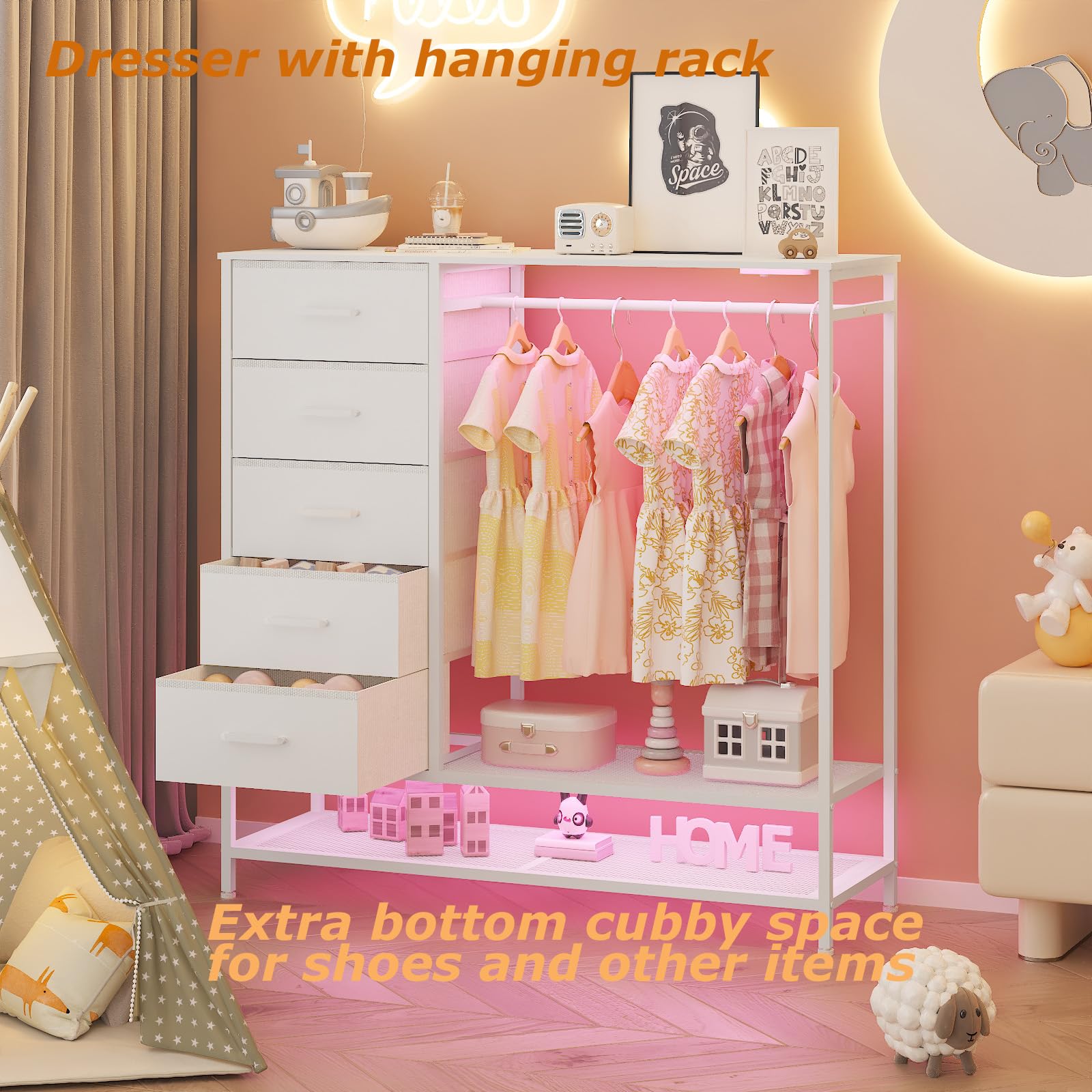 Dresser for Bedroom, Dresser with Hanging Rack Led Lights and Charging Station, White Bedroom Dresser with 5 Fabric Chest of Drawers with PU Finish Storage Organizer, for Living Room Kids Room, White