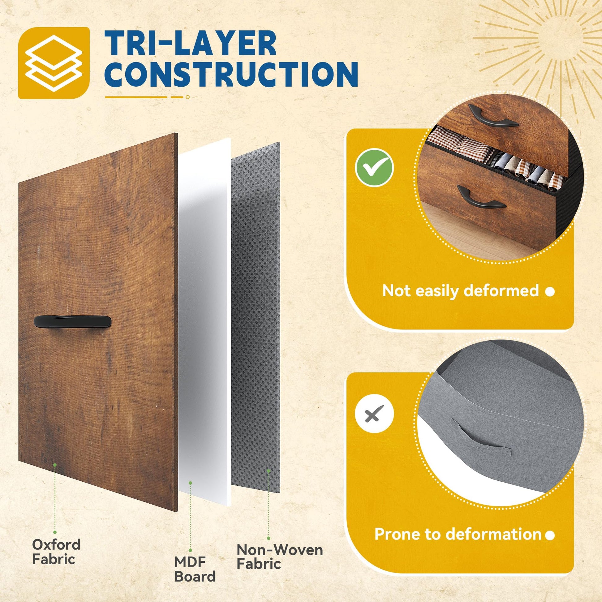 - STURDY CHEST OF DRAWERS- Strong metal frame aptly supports the overall structure; Premium MDF wooden top plus non-woven synthetic fabric increases durability