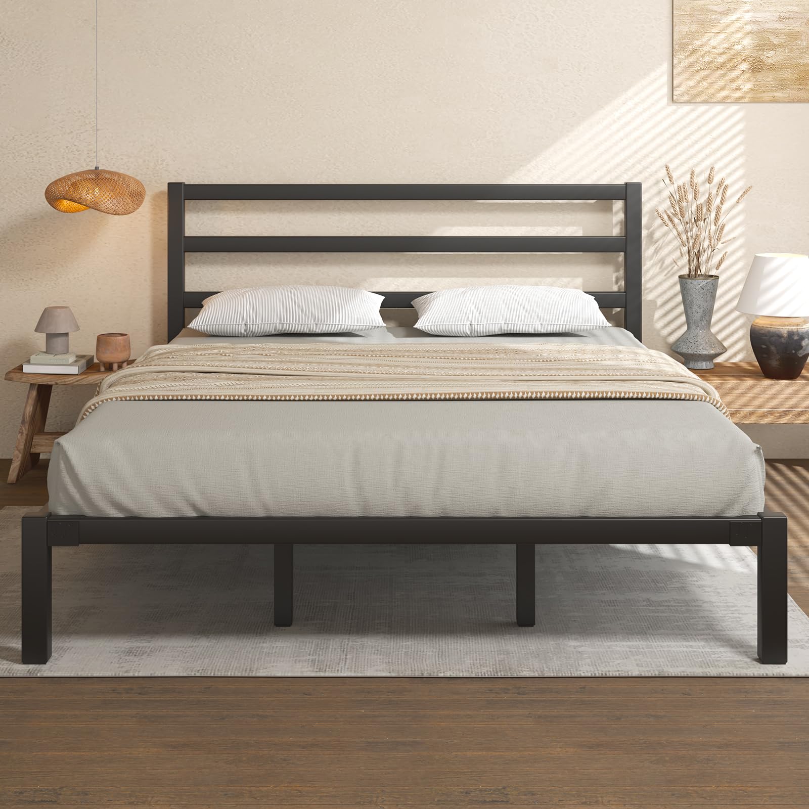 E-Motie King Size Bed Frame, Metal Platform Bed Frame with Headboard, Mattress Foundation with Spacious Underbed Storage, No Box Spring Needed, Easy Assembly, Modern, Black