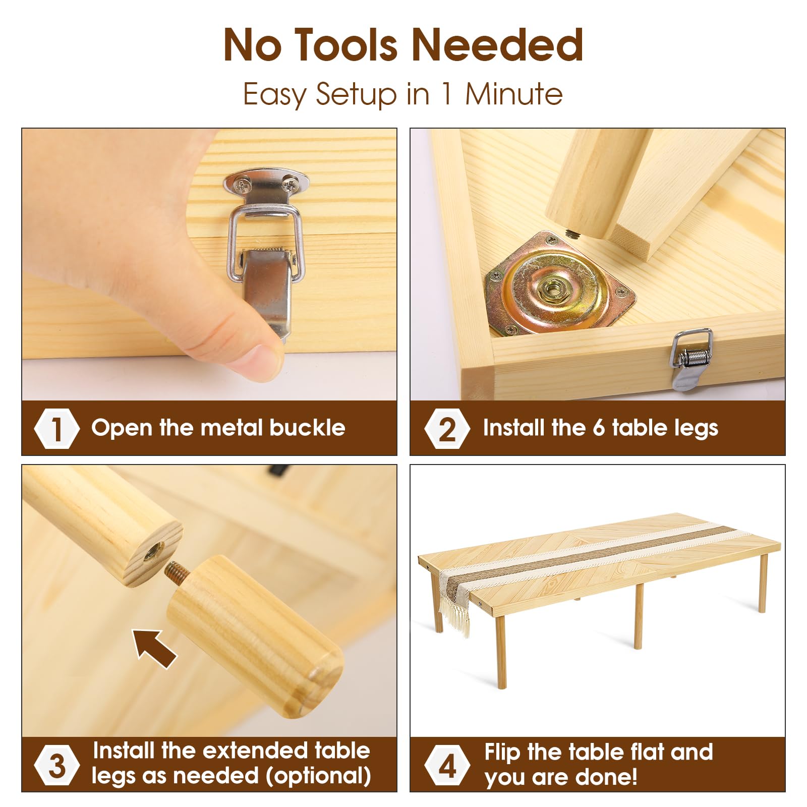 Folding Picnic Table with Table Runner, Portable Boho Low Picnic Table for Indoor Outdoor, 60" x 30" Wooden Table with Adjustable Heights for Camping, Wedding, Beach, Garden, Party(Large Size for 6)