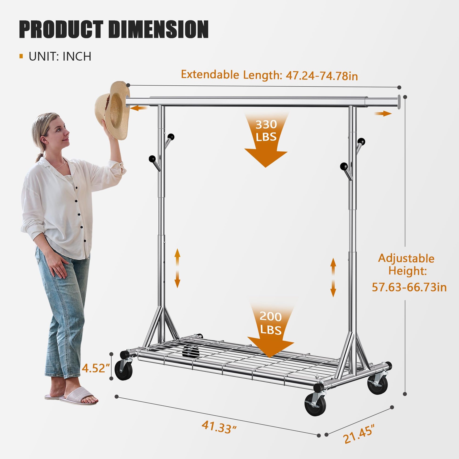 - 🧥【Adjustable Clothes Rack】Dimensions: 47.24'-74.78' L x 21.45' W x 57.63-66.73' H.The extensible horizontal rod of rolling garment rack from 47.24' to 74.78'. Height adjustable from 57.63' to 66.73' accommodates multiple short and long garments.
