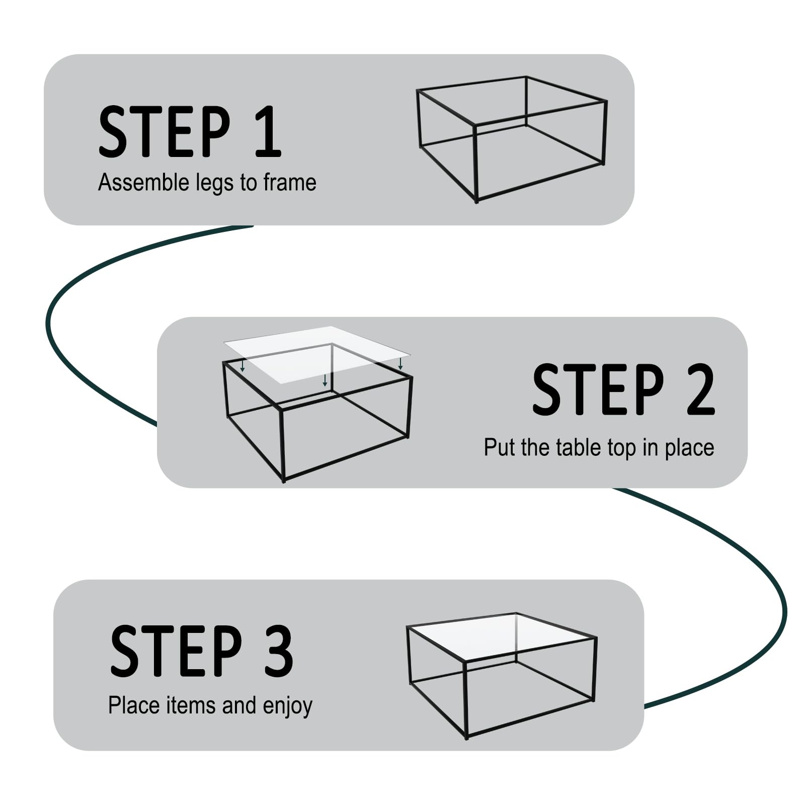 - Easy Assembly:Only need 5 minutes to set your coffee table and use right away. Tempered transparent glass with black square metal frame without extra decoration, minimalist lines will never go out of style.