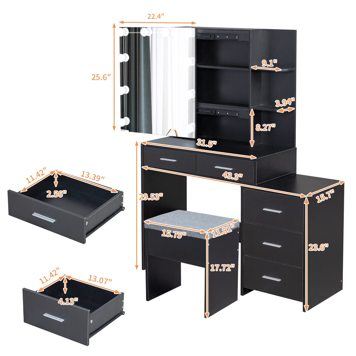 - MULTIPLE SHELVES & DRAWERS FOR STORAGE - Still trouble with the mess of your beauty products? This vanity set with shelves and drawers will help you. There are hidden storage shelves behind the mirror, open shelves next to the mirror, and storage drawers. You can always find a place for your cosmetics, jewelry, and hair accessories.