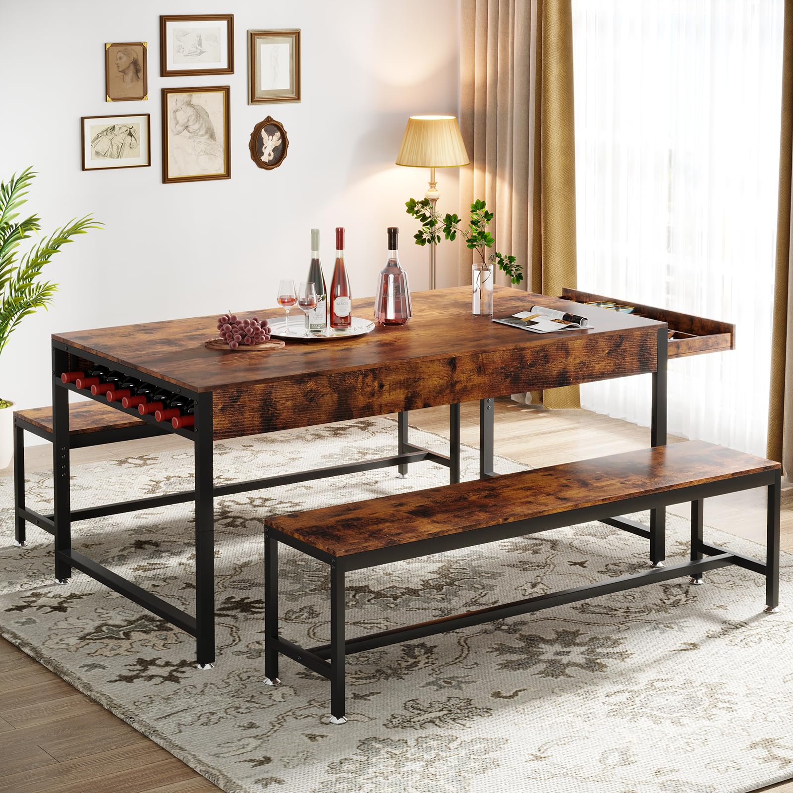 Loomie 63" Dining Table Set for 4-6, 3-Piece Kitchen Table with 2 Utensil Drawers, 2 Benches & Wine Rack, Modern Space Saving & Heavy Duty Dinner Table Set with Metal Frame & MDF Board,Rustic Brown