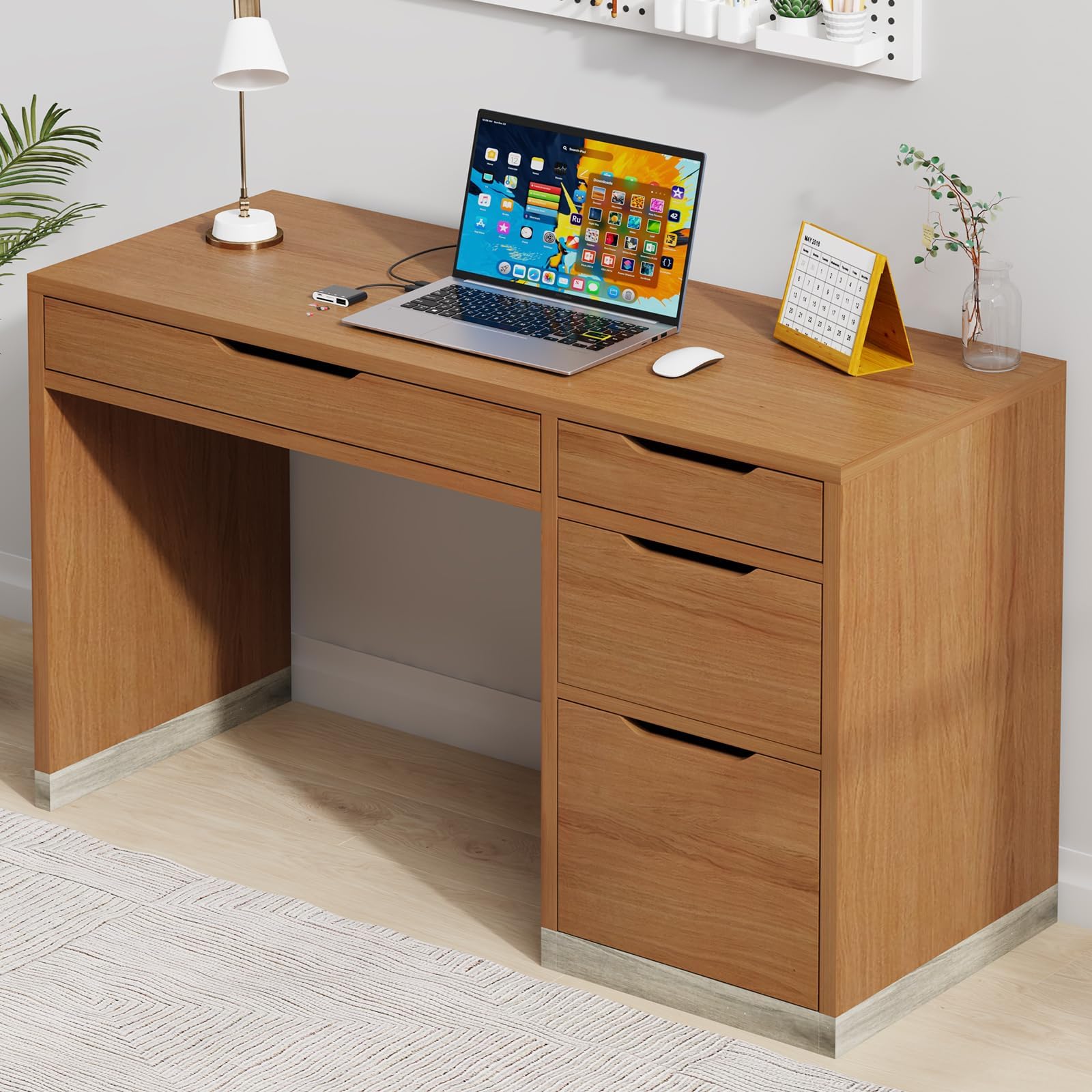 MaverickFurni 52 Inch Desk with 4 Drawers, Small Computer Desk for Small Space, Home Office Desk with Storage File Cabinet for Bedroom, Brown