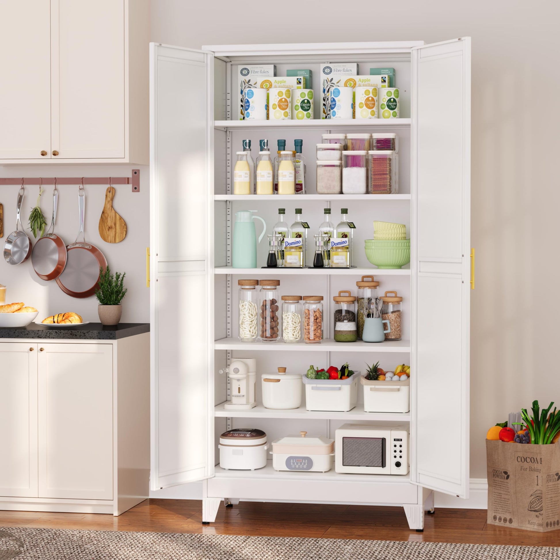 Metal Pantry Cabinet with 2 Doors and 5 Adjustable Shelves, 75" Kitchen Storage cabinets with Gold Handles, Versatile Storage for Laundry Room, Living Room, Bathroom, Dinning Room, Utility Room-White