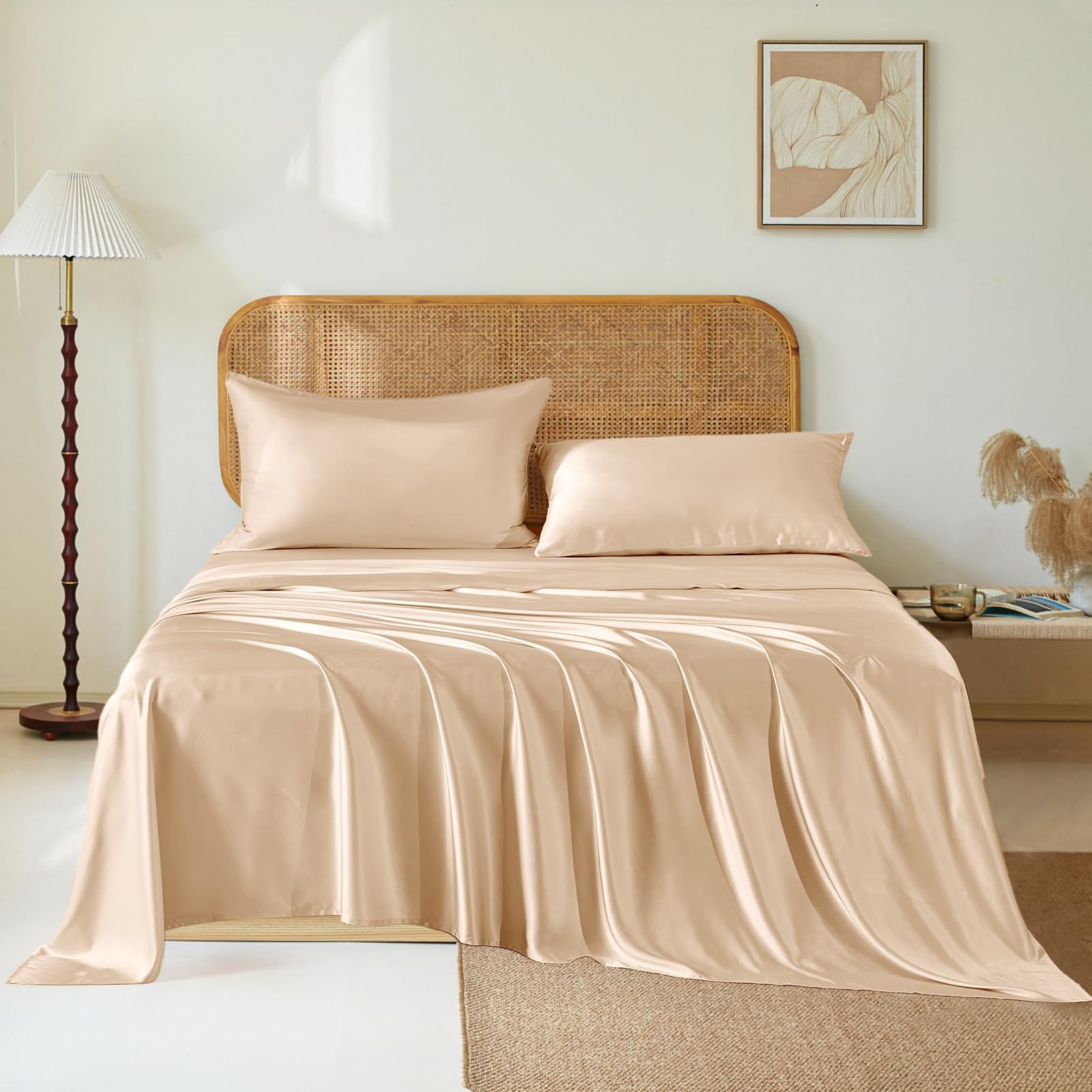 THXSILK Luxury Mulberry Silk Bed Sheets Set - 4pcs Silk Sheets Set 16" Deep Pocket - 1 Fitted Sheet, 1 Flat Sheet, 2 Pillowcases with Zipper Closure - King, Champagne