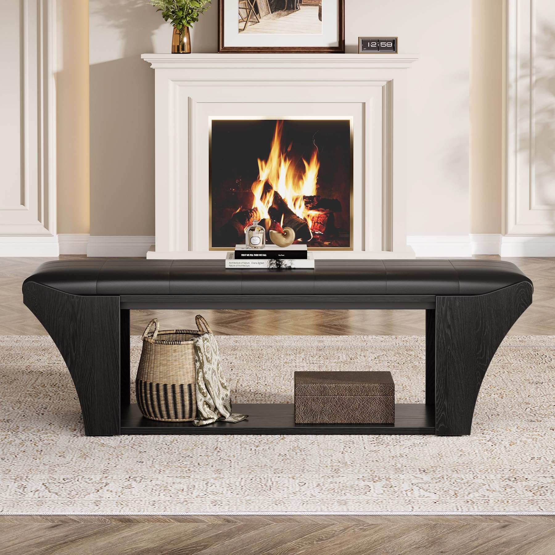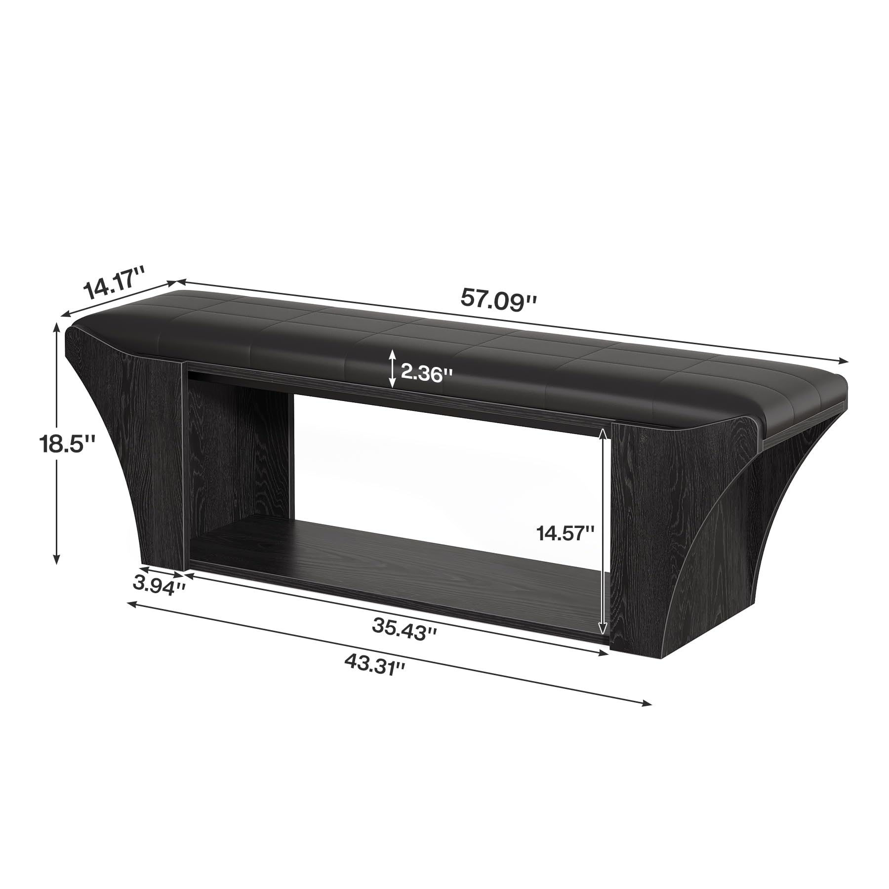 Tribesigns 59" Long Dining Room Bench for 2 to 3, Modern Black Kitchen Benches Upholstered Stools with Leather Padded Seat and Open Storage Shelf for Indoor Use
