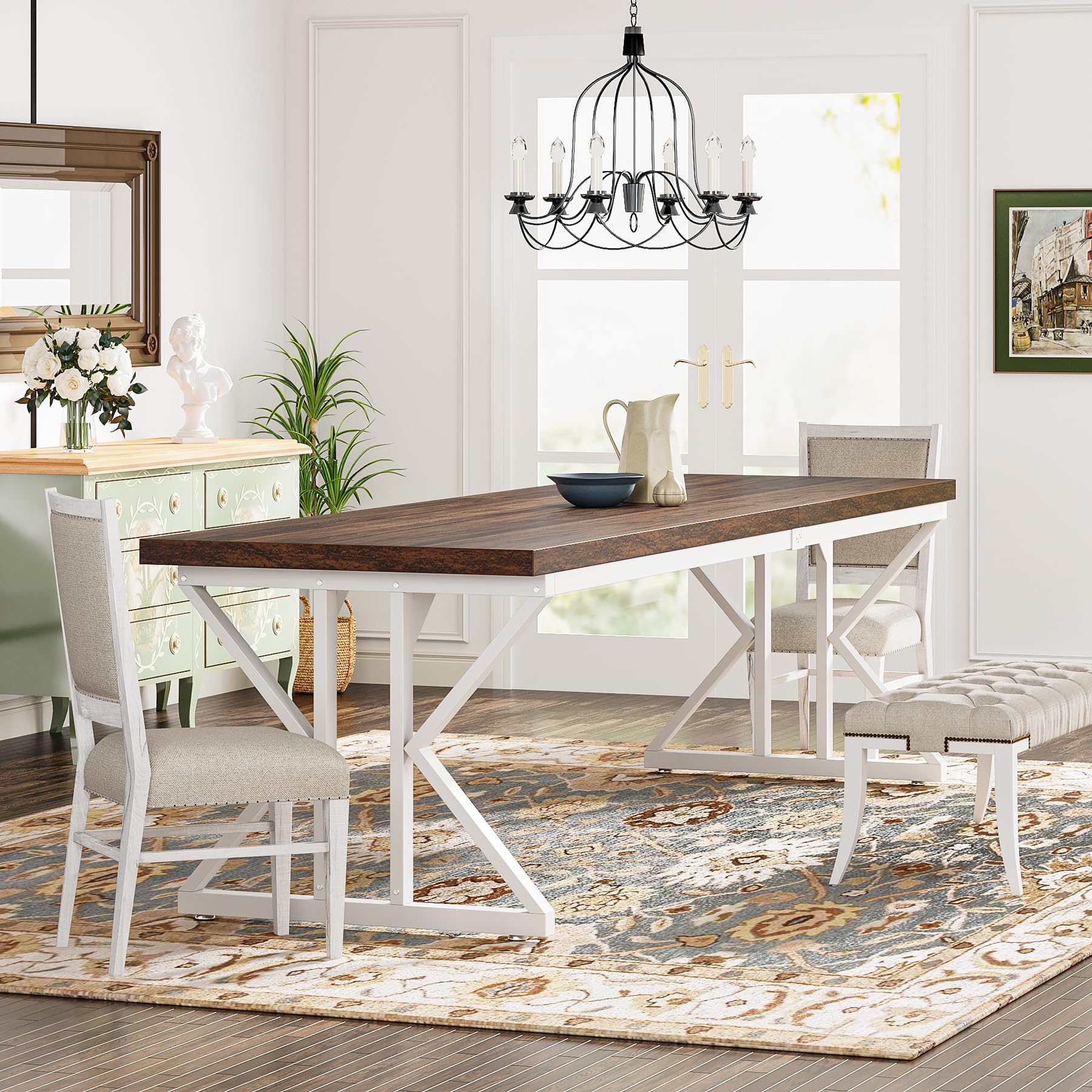 - [Farmhouse Style]: Make mealtime marvelous with this delightful dining table! Pairing farmhouse-inspired charm with clean modern lines, the classic vintage brown table top and white trestle base create a stylish contrast for an eye-catching.