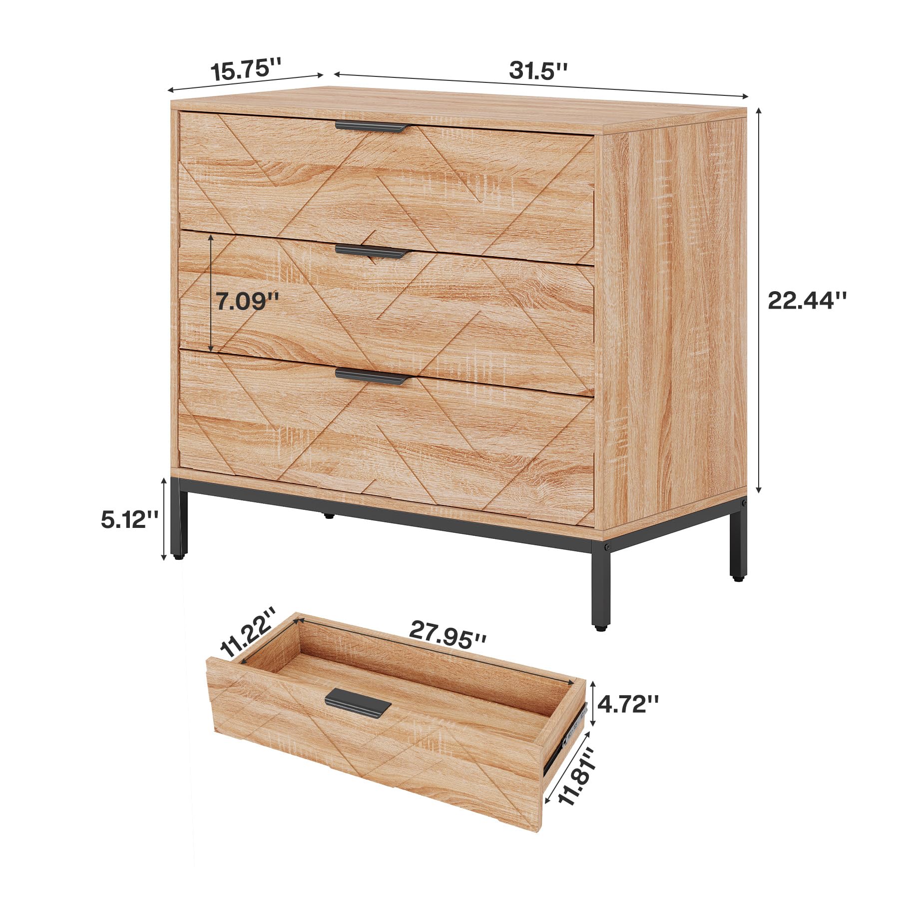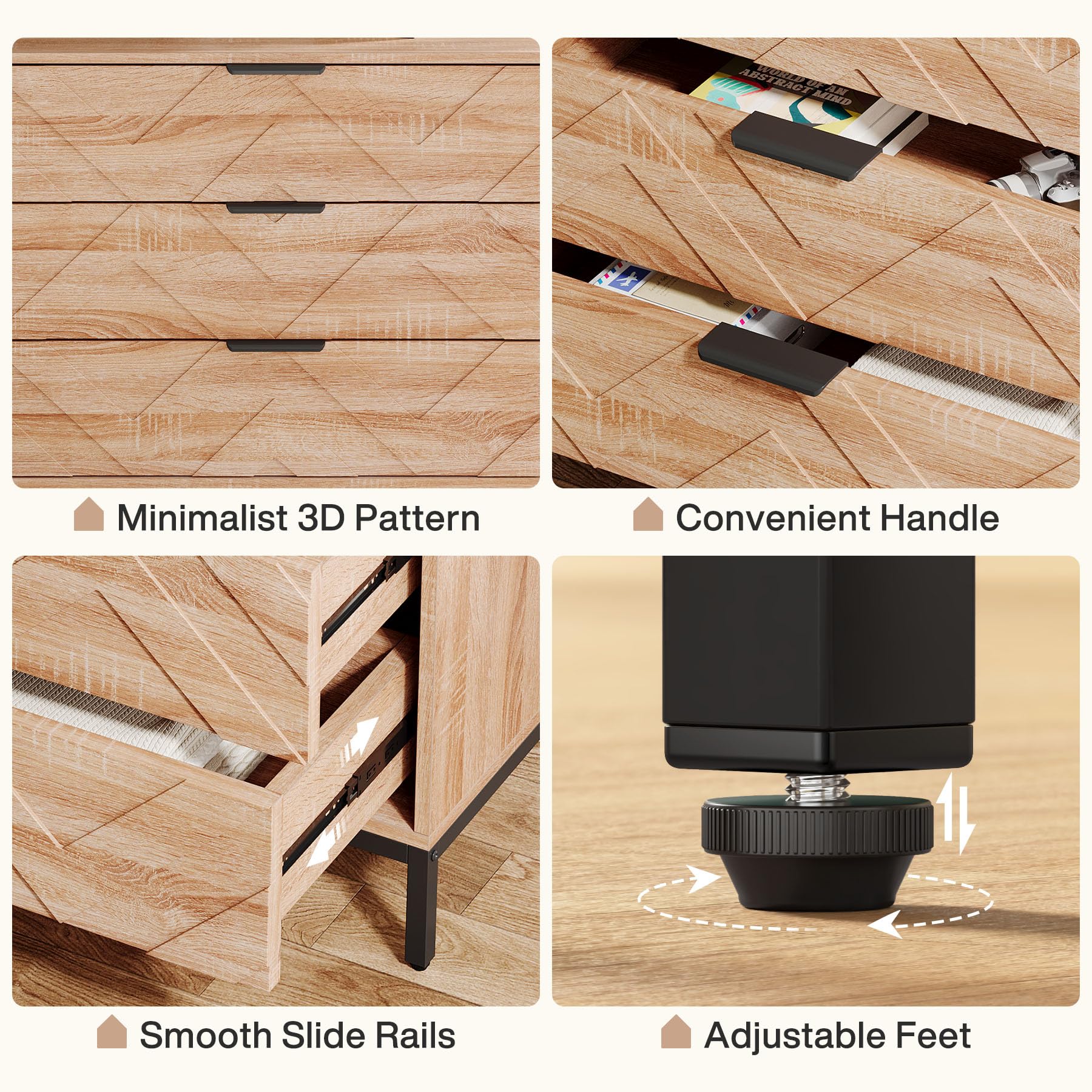 - Unique Geometric Design: Boasting a distinctive geometric pattern on the drawer fronts, this nightstand adds a touch of modern elegance to your bedroom decor. The wood-grain finish complements a wide range of interior styles, from contemporary to rustic