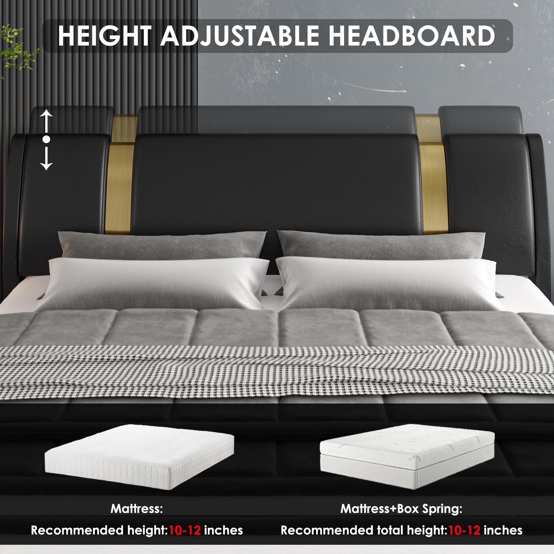 TTVIEW Modern Faux Leather Upholstered Platform Bed Frame with Golden Iron Metal Decor, Adjustable Curved Headboard, Wooden Slats Support, No Box Spring Needed, Queen Size, Black