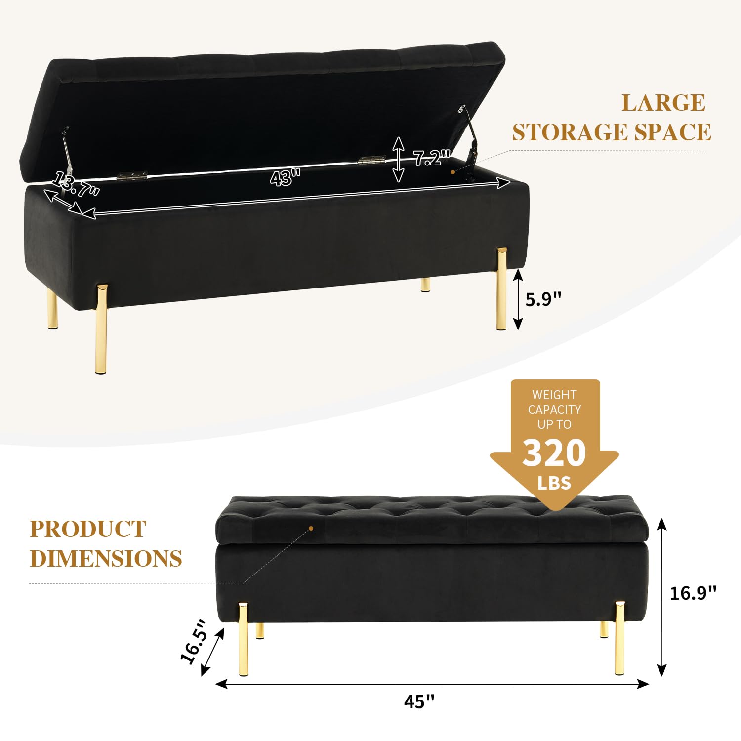 - Durable: This storage ottoman bench is made of high-quality velvet, which is not easily perishable or scratched, and the interior is highly filled, making it extremely soft and durable. The bench legs are made of solid metal and the frame of the storage stool is made of high quality solid wood, can hold 320 pounds without worrying about rust or load-bearing