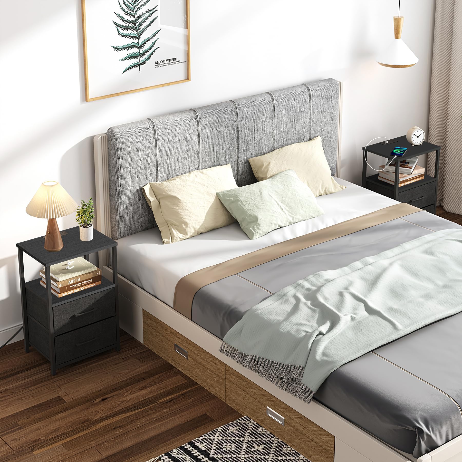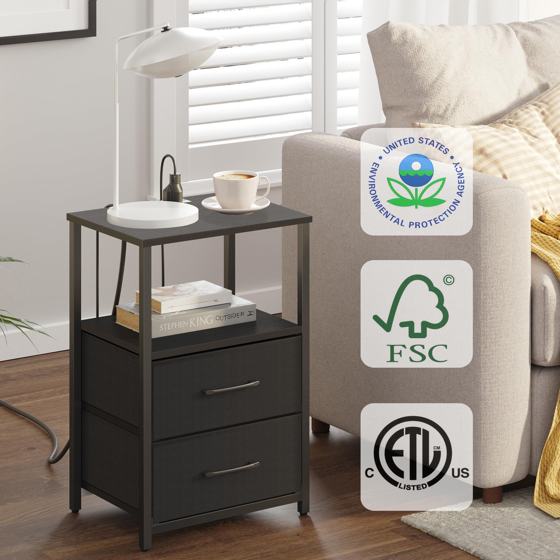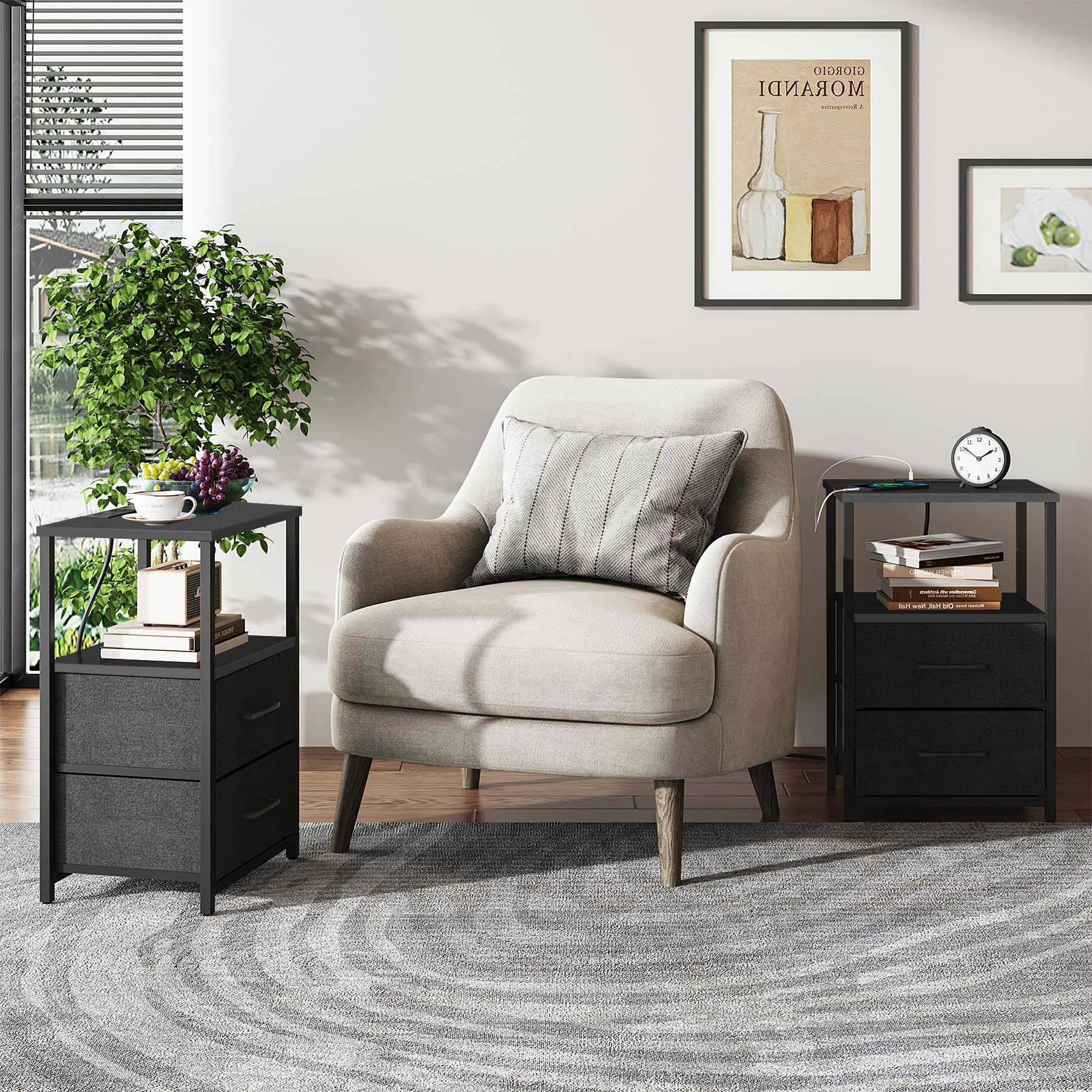 TUTOTAK End Table with Charging Station, Side Table with 2 USB Ports and Outlets, Nightstand with Cloth Drawer, Set of 2, Couch Table, Black TB01BK052