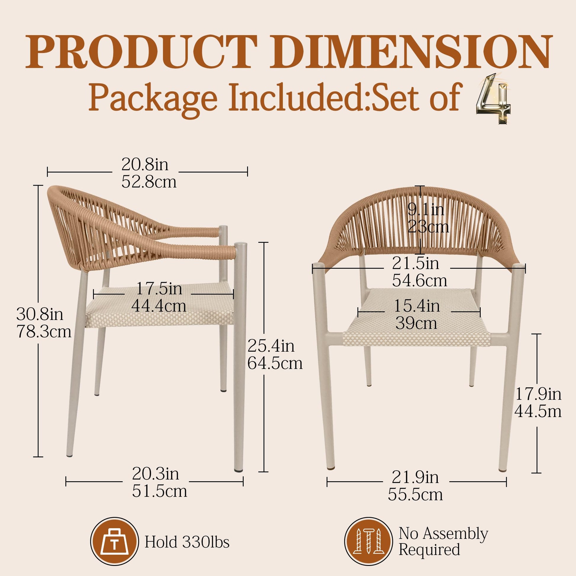 - No Required Assembly: You can use it immediately when you receive stackable patio chairs, no need to assemble. Comes with 4 chairs, each sized 21.9'(L) x 20.3'(W) x 30.8'(H), and weighing 24.7 pounds overall; All materials are designed for easy care. It will be delivered to you in about a week