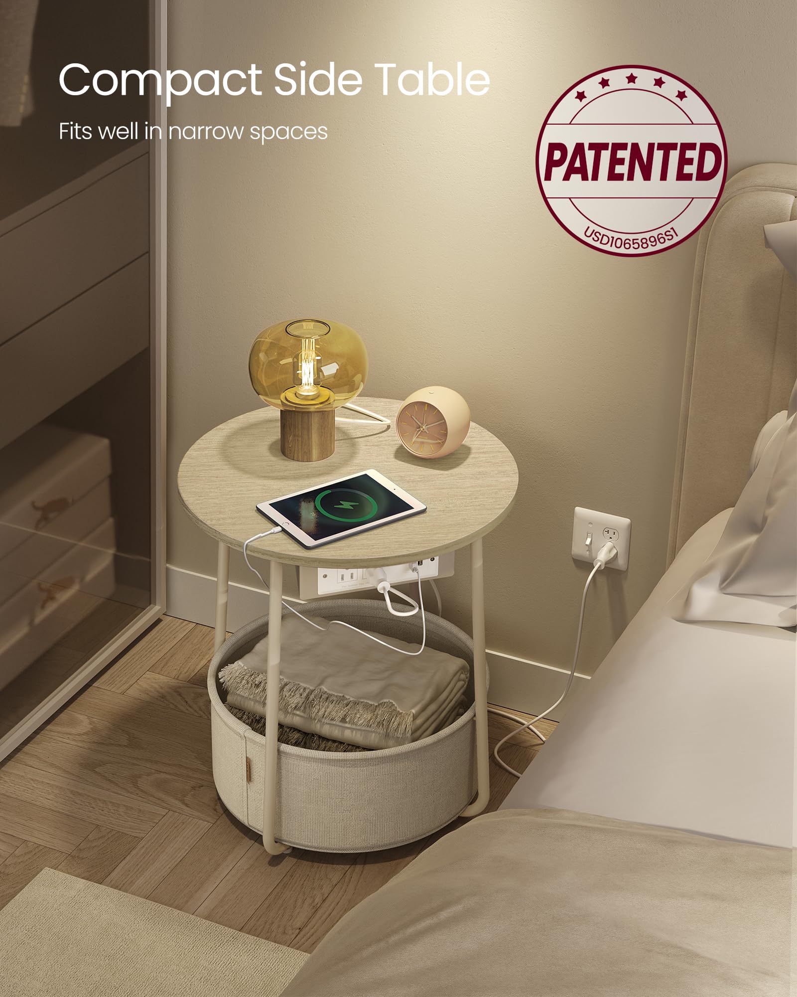 VASAGLE Side Table with Charging Station, Round End Table with Fabric Basket, Nightstand with Power Outlets, USB Ports, for Living Room, Bedroom, Modern, Cream White ULET228N01