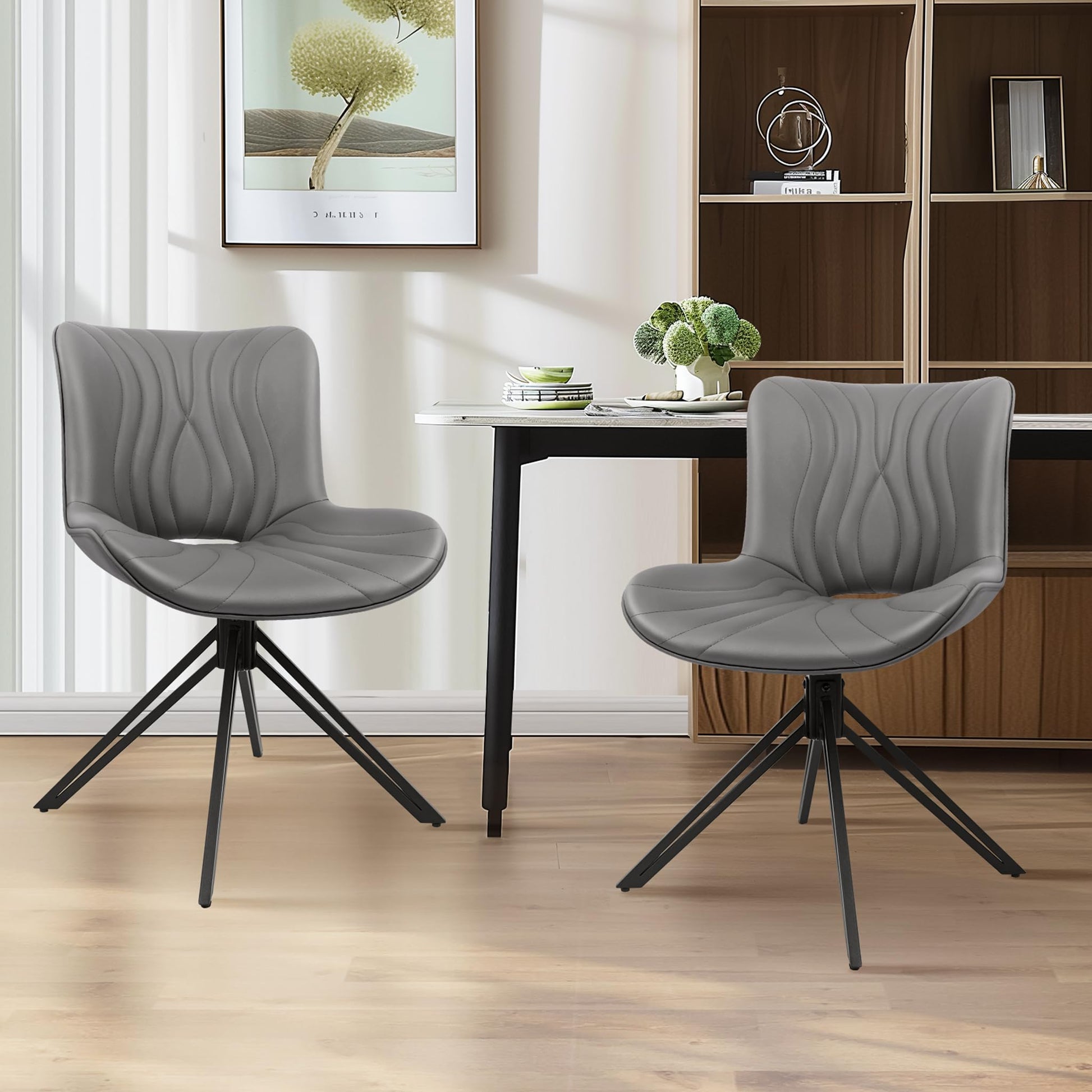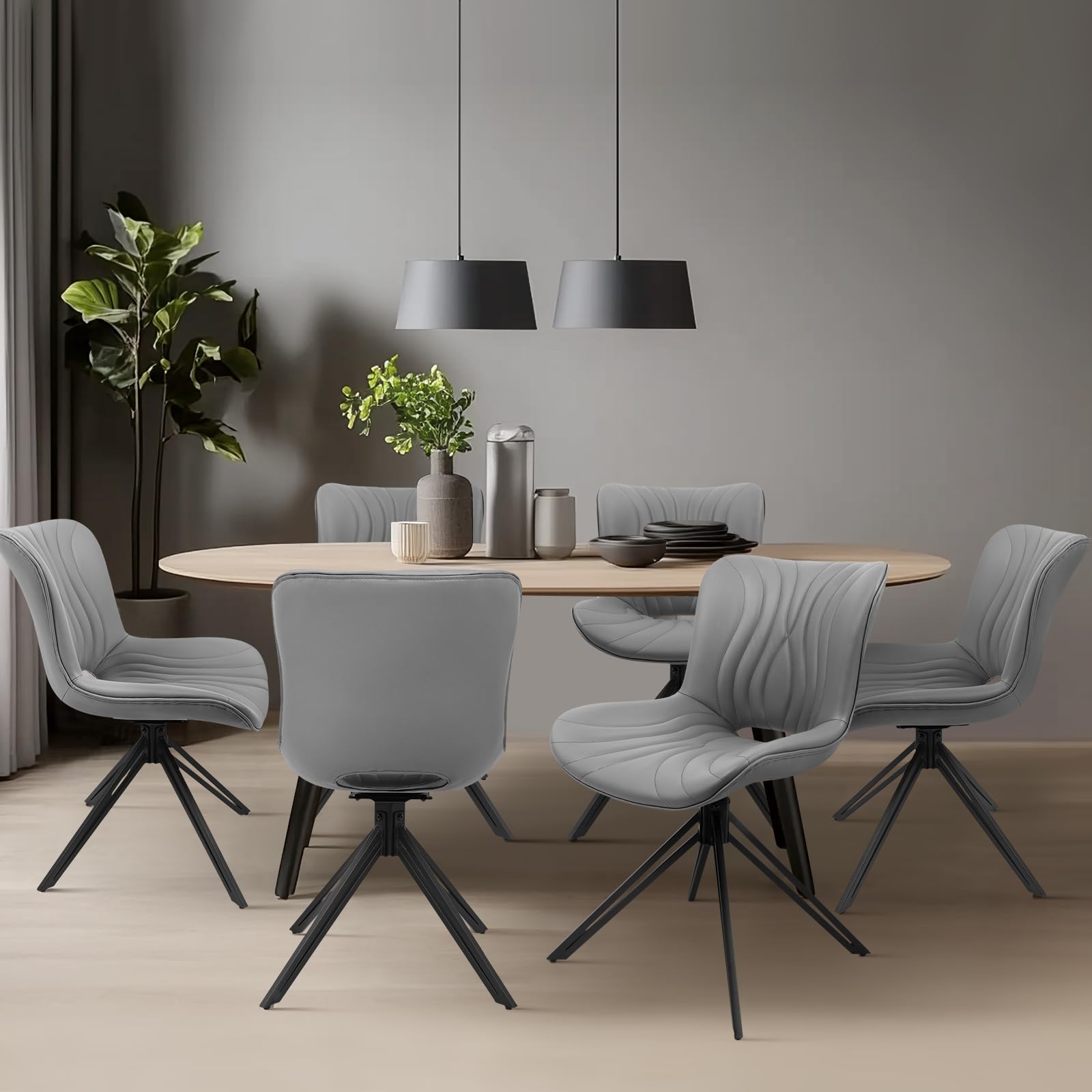 VATROS Dining Chairs Set of 6, 360° Swivel Upholstered Mid-Century Modern Kitchen Dining Room Chairs, Armless Faux Leather Accent Side Chair with Padded Back, Metal Legs for Living Room Bedrooms,Grey