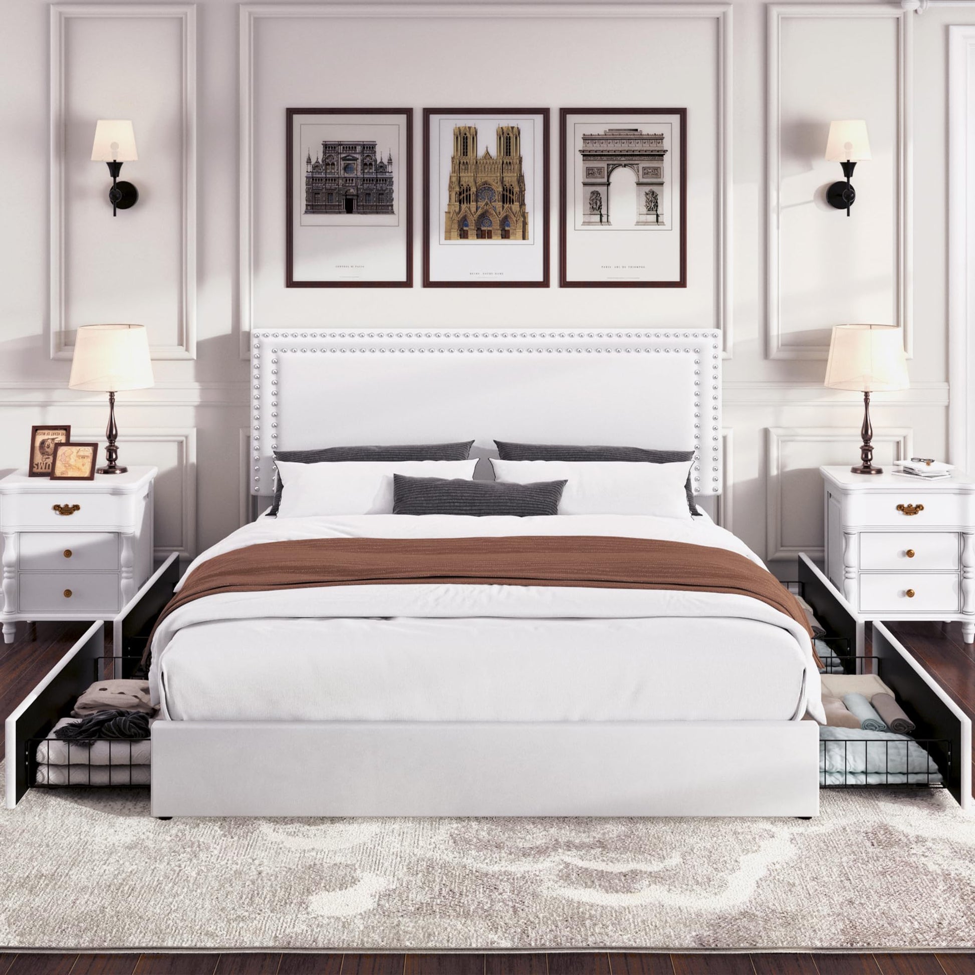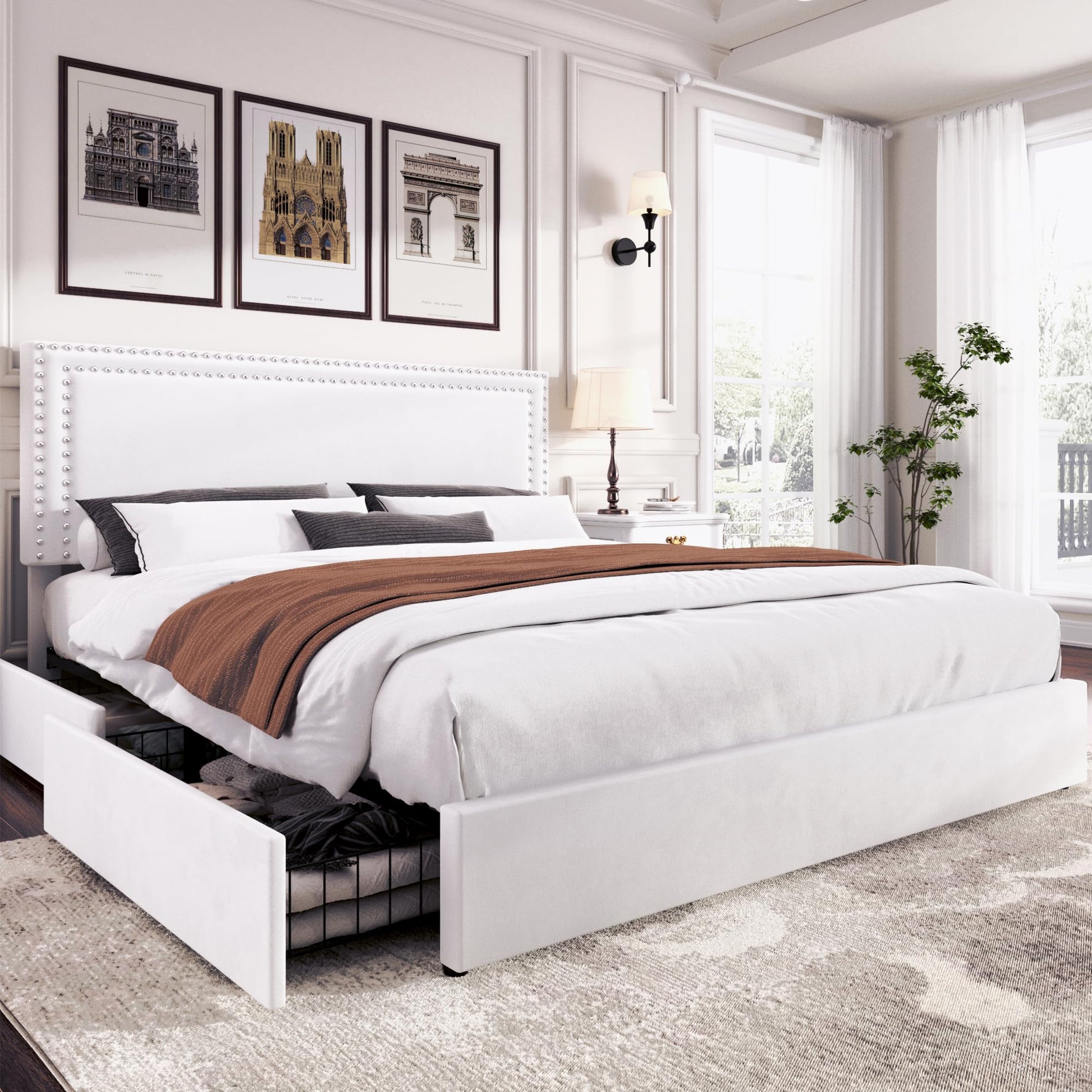 Details: VECELO King Size Upholstered Platform Bed Frame with 4 Storage Drawers, Adjustable Velvet Rivet Decor Headboard, Wooden Slats Support, No Box Spring Needed, Easy Assembly