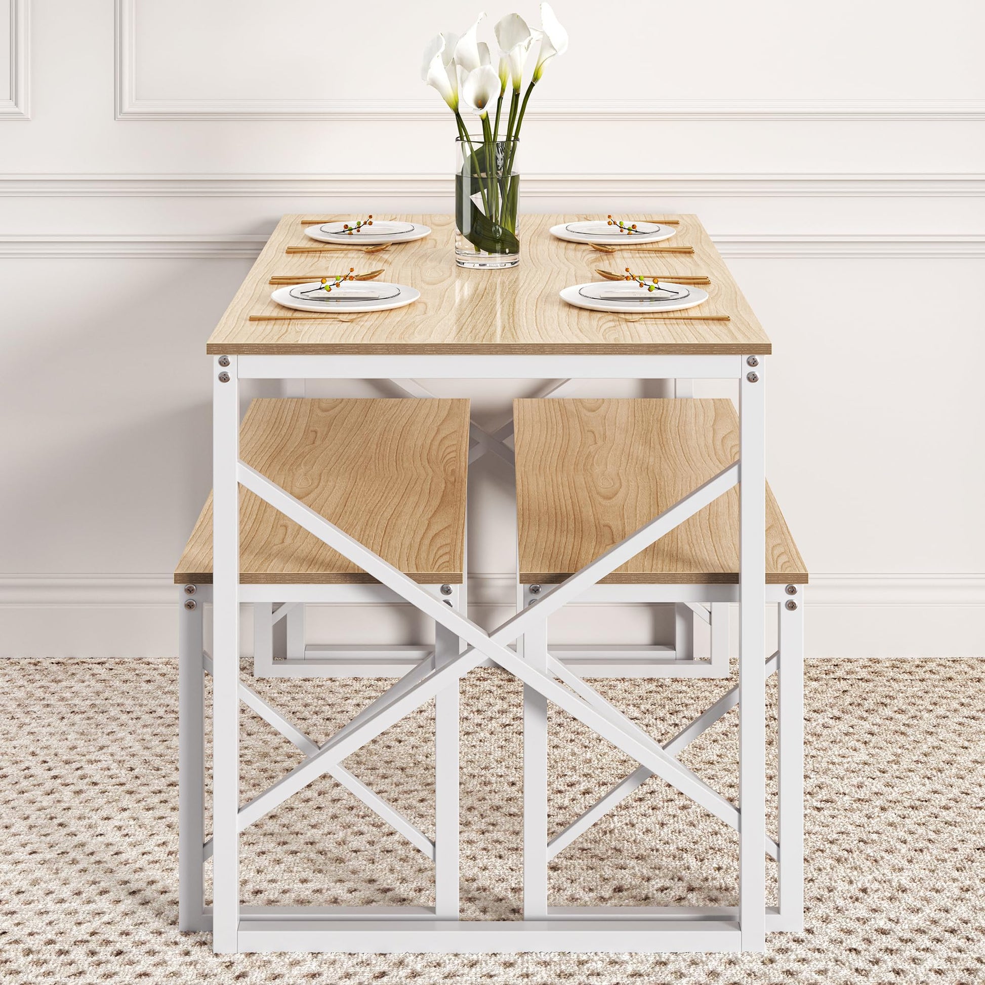 - Perfect for Small Spaces - This Dining Table Set includes a 43.3' long rectangle Table and 2 33.5' benches, designed specifically for small spaces. The bench can easily be completely stored underneath the table when not in use, saving you valuable space.