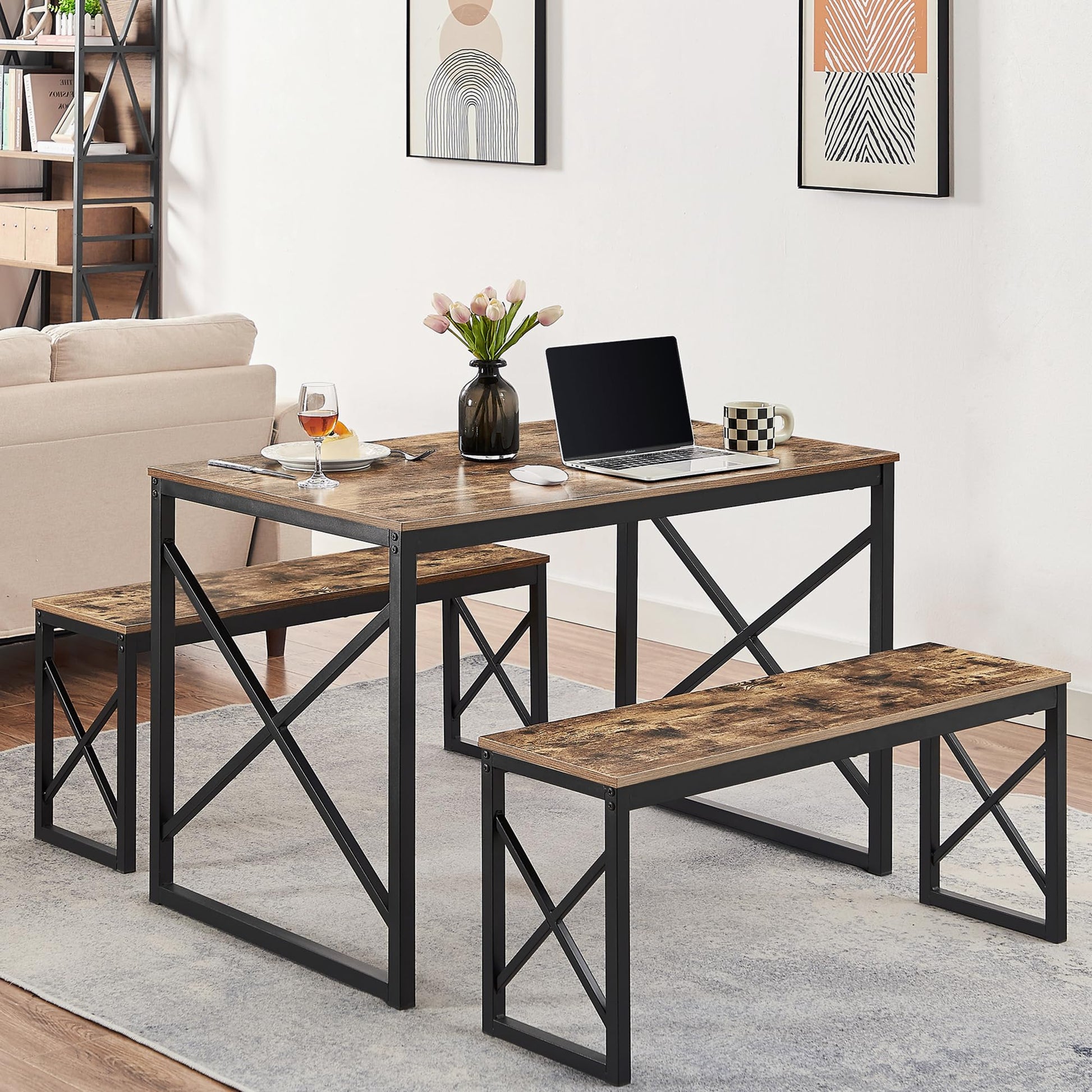 VECELO Kitchen Table with 2 Benches for 4, Wood Dining Room Dinette Sets for Breakfast Nook and Small Space, Brown