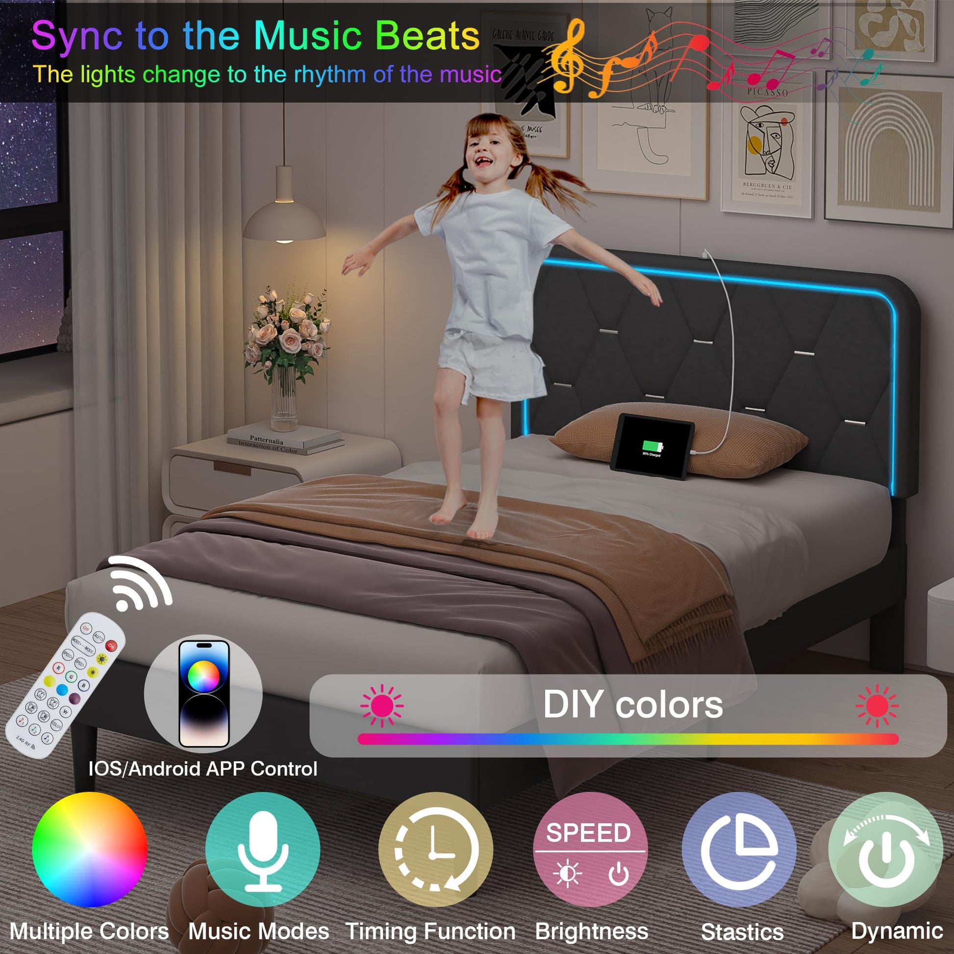 - Easy to Assemble: Our twin size platform bed frame with led lights come in one box with all parts, tools, and instructions. Follow the simple step to quick set up. Featuring Velcro and EVA noise-free strips, this velvet twin size bed reduces noise, providing a peaceful sleep where your bed mattress stays securely.