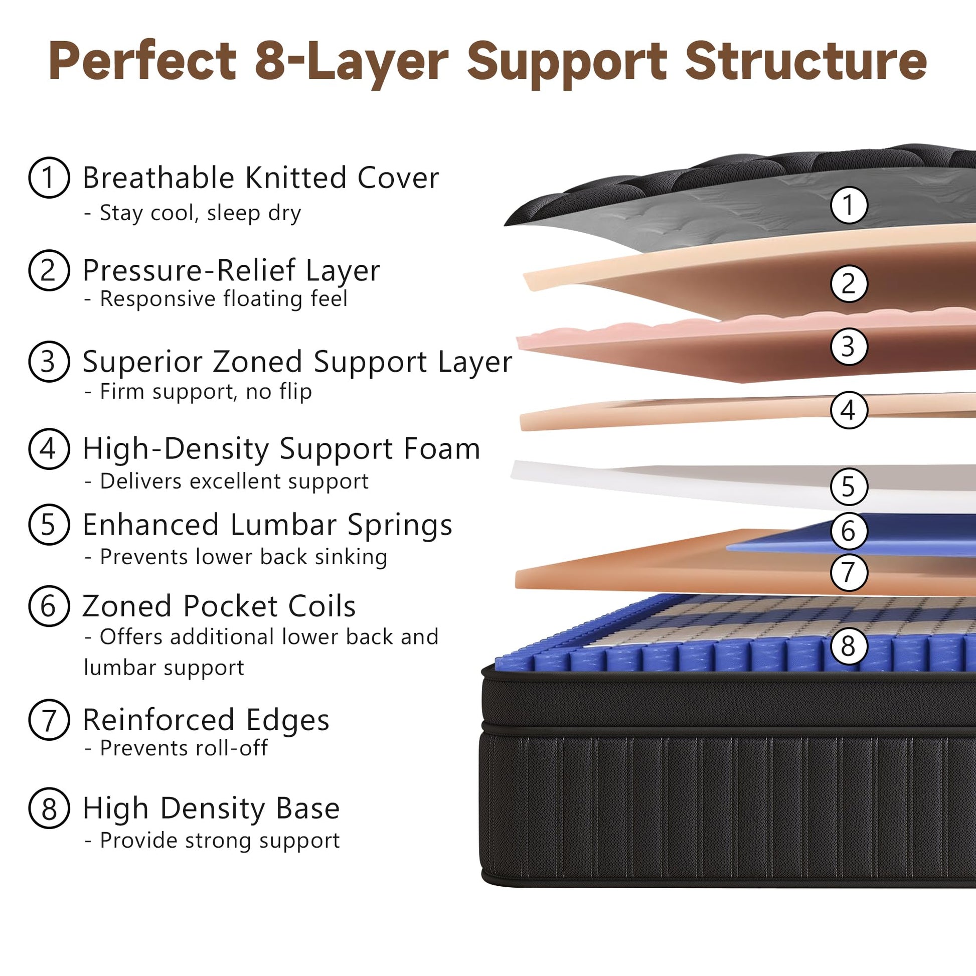 - Upgraded Support - This queen bed mattress has upgraded the built-in Pocket Springs and added a high-density support sponge on the side, which makes the mattress more stable and reduces the risk of edge rolling during night exercise, thus improving safety. The upgraded edge also protects the internal structure, extend the life of the mattress.