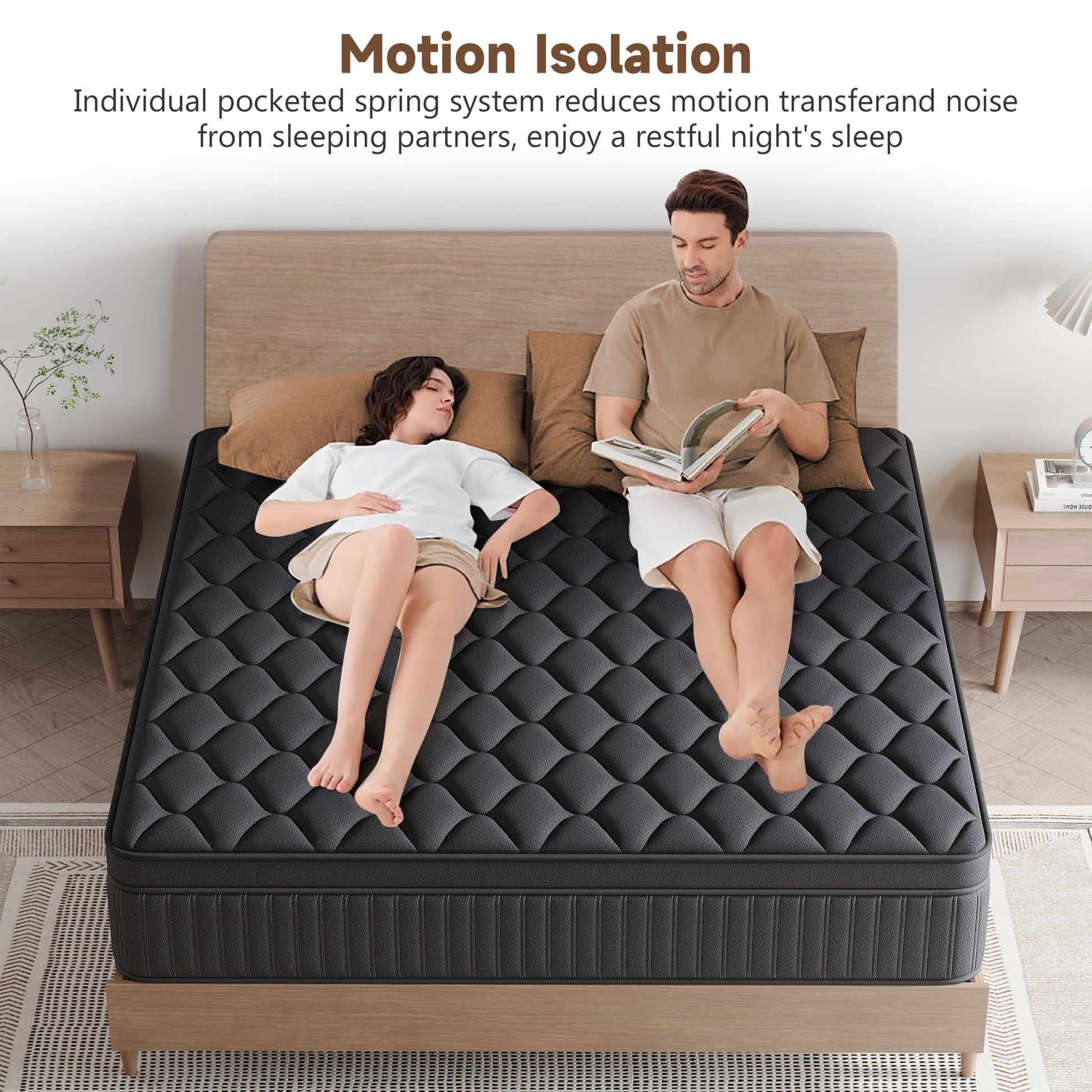 - Quiet & Motion Isolation Individual Springs - Queen size mattress has a high quality individual pocket coil and slow rebound memory sponge that effectively absorbs the noise and vibration caused by turning over during sleep, minimizing the transfer of motion to your partner and allowing you to enjoy deep sleep without being disturbed.