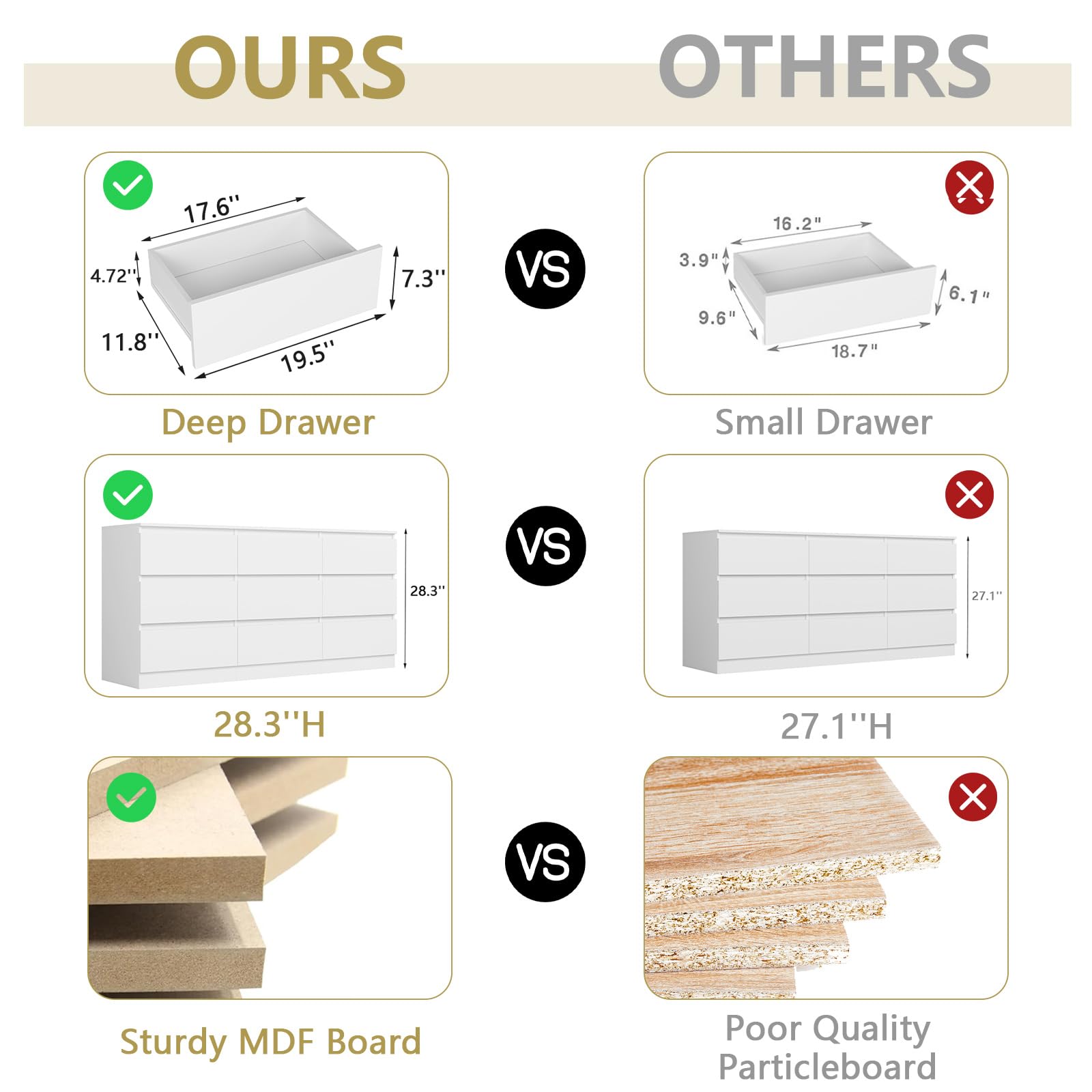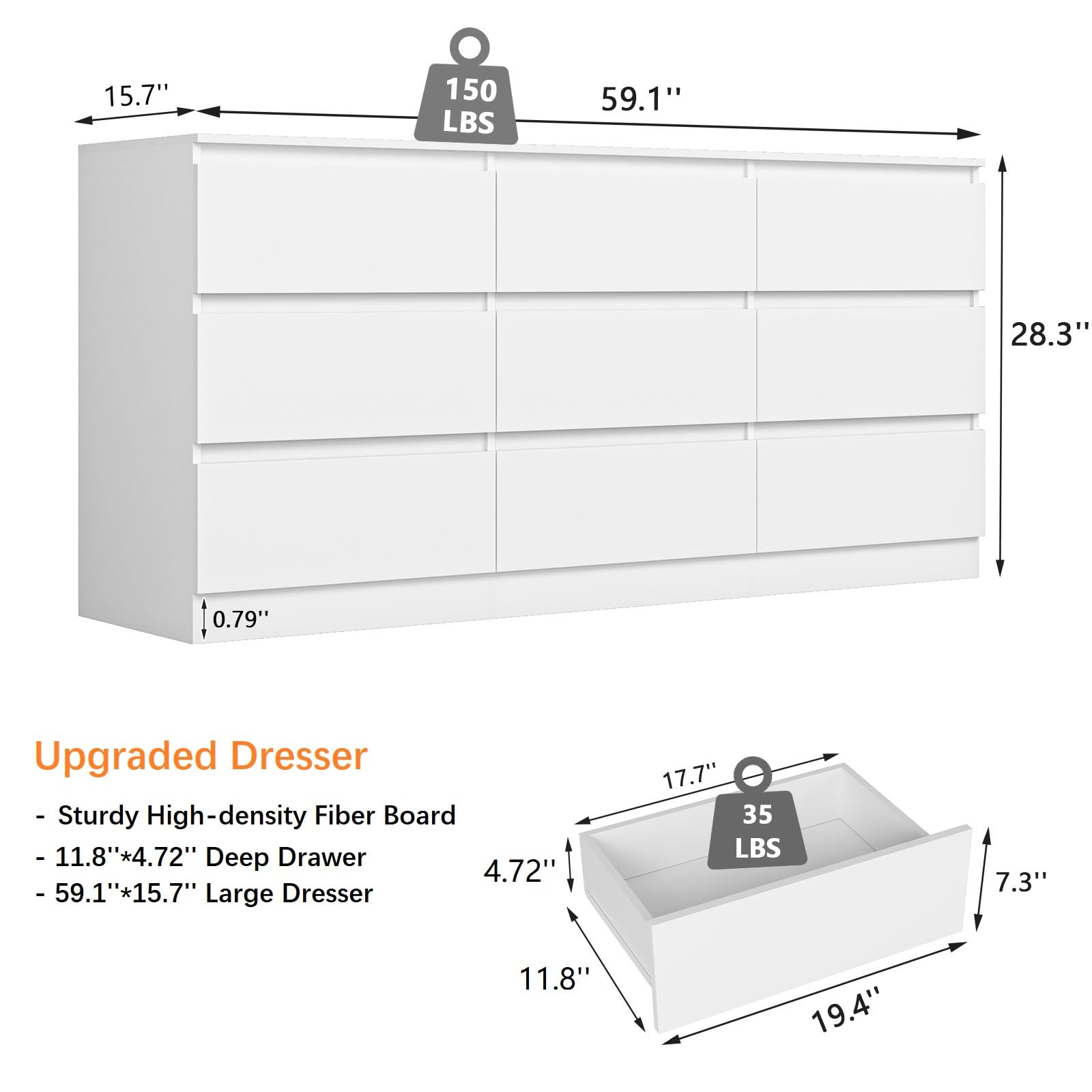 - 【Large Storage Space】 Measuring 59.1''L x 15.75''D x 28.3''H ,which is bigger than normal bedroom dresser size, our modern dresser has 9 deep storage drawers(19.5''Wx4.7''Hx11.8''D,weight capacity :35lbs), drawer size is deeper than others,which can store your clothes, toys, books, or any other personal items, making it easier for you to sort and store clutter! spacious tabletop is perfect to place frequently used items, keeping them in your reach.